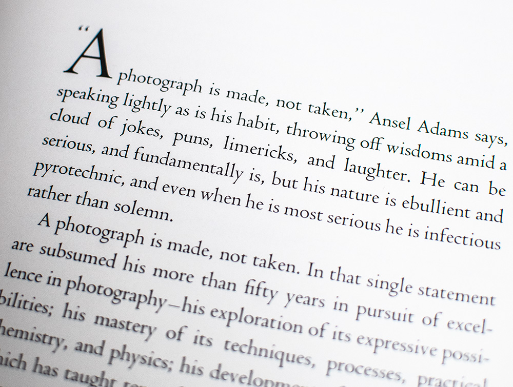 "Ansel Adams had a greater impact upon creative photography than any other person in this century." Images 1923-1974 is his "first very-large-format book… In full control, Ansel produced his ideal book, comprising his personal choice of pictures, state-of-the-art reproduction, graceful words and elegant design. He selected the 115 photographs that he believed best represented the range of his vision, choosing (as he always did when it was up to him) a wide spectrum of portraits, details, abstracts and occasional quirky subjects, as well as a smattering of his grand landscapes… Images was both a great aesthetic and a commercial success, elected as one of the 50 Books of the Year by the American Institute of Graphic Arts and awarded first prize at the World Book Fair in Leipzig, Germany" (Alinder, 266, 307, 388). To Pulitzer Prize-winning writer Wallace Stegner, who authored the introduction, Adams' "mind and vision, his reverence, his delicacy and strength, will have the power to move and enhance and enlarge us as long as walls exist for photographs" (Miraculous Instants, 51-2). Images remains "one of the handsomest books of its kind ever made" (New York Times).