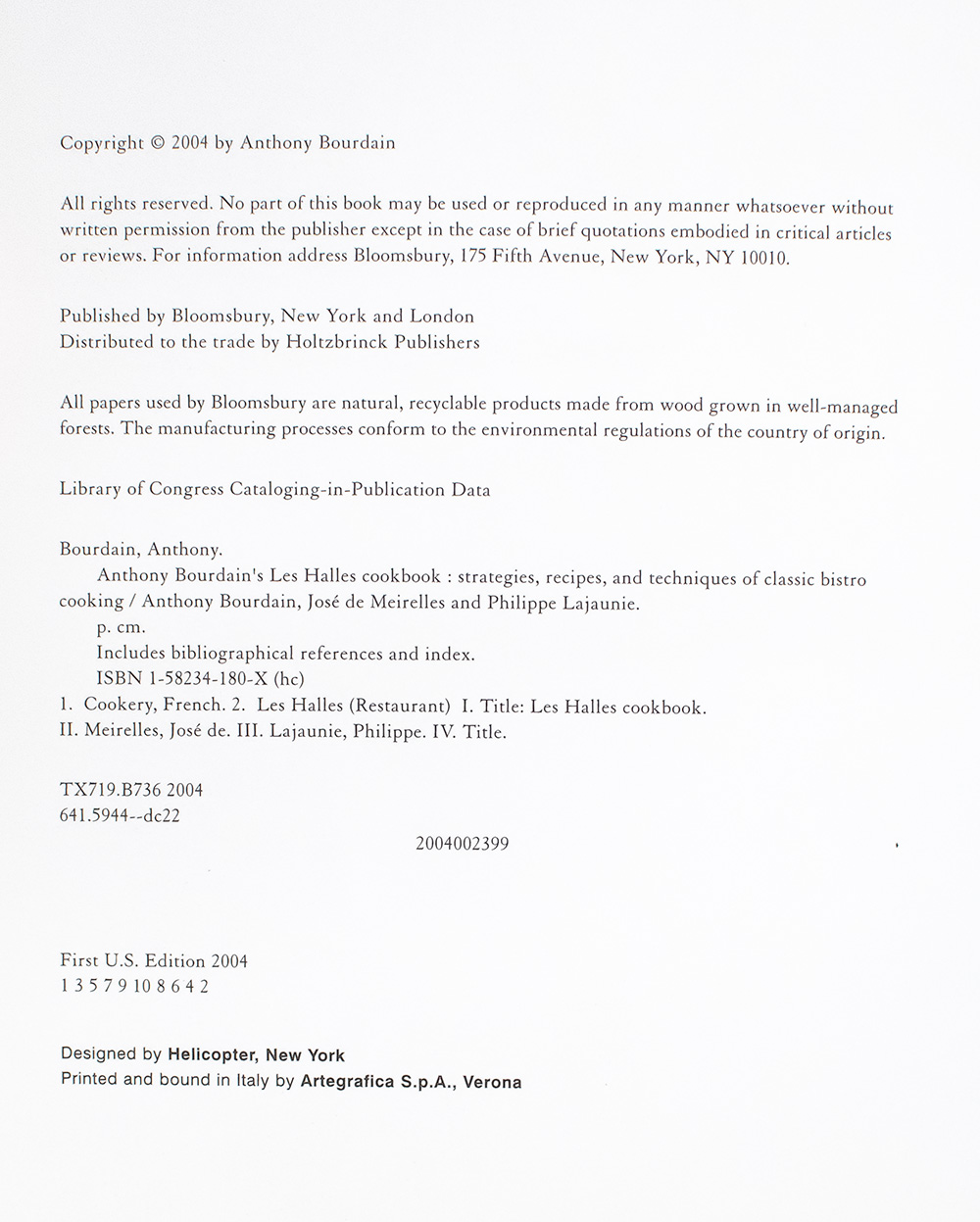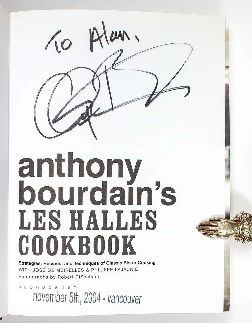 First edition of Bourdain's classic French bistro cookbook. Octavo, original pictorial boards, pictorial endpapers, illustrated with photographs by Robert Discalfani. Presentation copy, inscribed by the author on the title page, "To Alan, Anthony Bourdain." Fine in a near fine dust jacket. Jacket design by Helicopter. Jacket photograph by Robert Discalfani.
