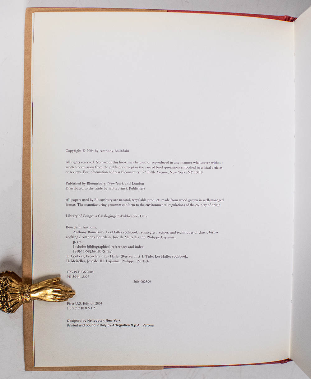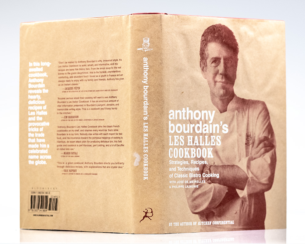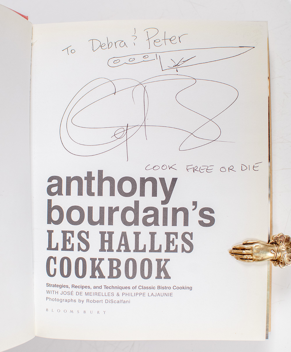First edition of Bourdain's classic French bistro cookbook. Octavo, original pictorial boards, pictorial endpapers, illustrated with photographs by Robert Discalfani. Presentation copy, inscribed by the author who has drawn an image of a knife on the title page, "To Debra and Peter Anthony Bourdain Cook Free or Die." Fine in a near fine dust jacket. Jacket design by Helicopter. Jacket photograph by Robert Discalfani.
