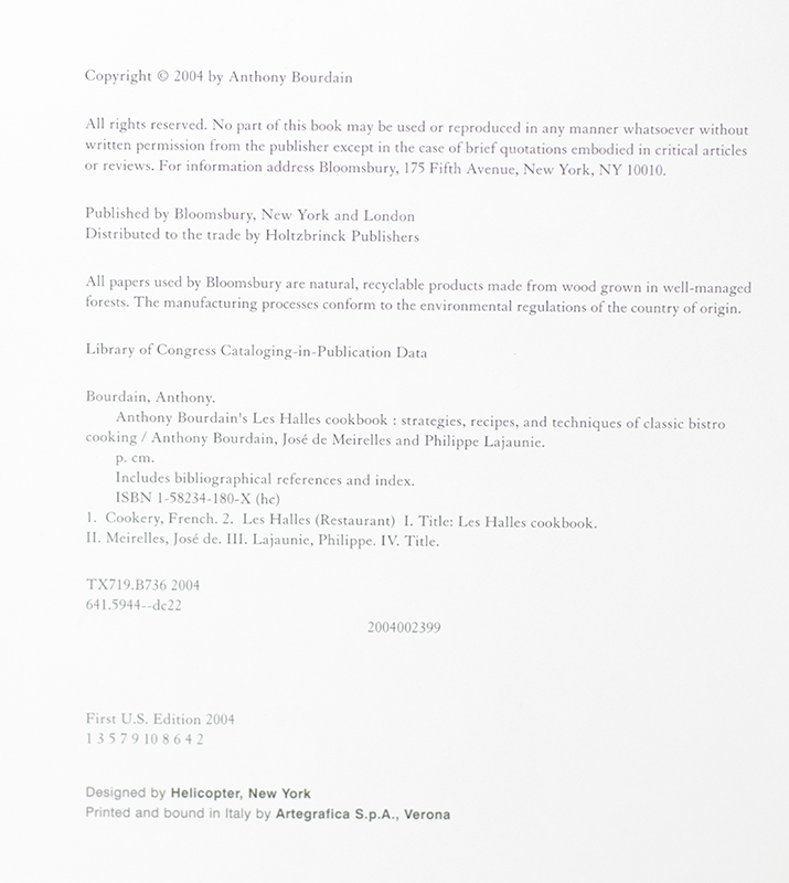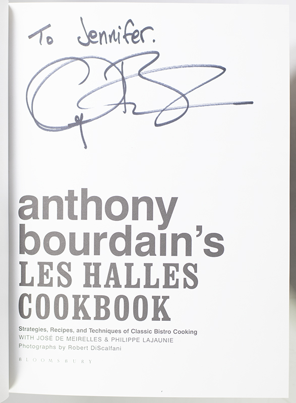 "The absolute foundation of professional cooking, and the most useful thing I can teach you, is the concept of mise en place. As a cook, youR "meez" is your first principle, your belief system, your religion, your Tao": First Edition of Anthony Bourdain's Les Halles Cookbook; Inscribed by him