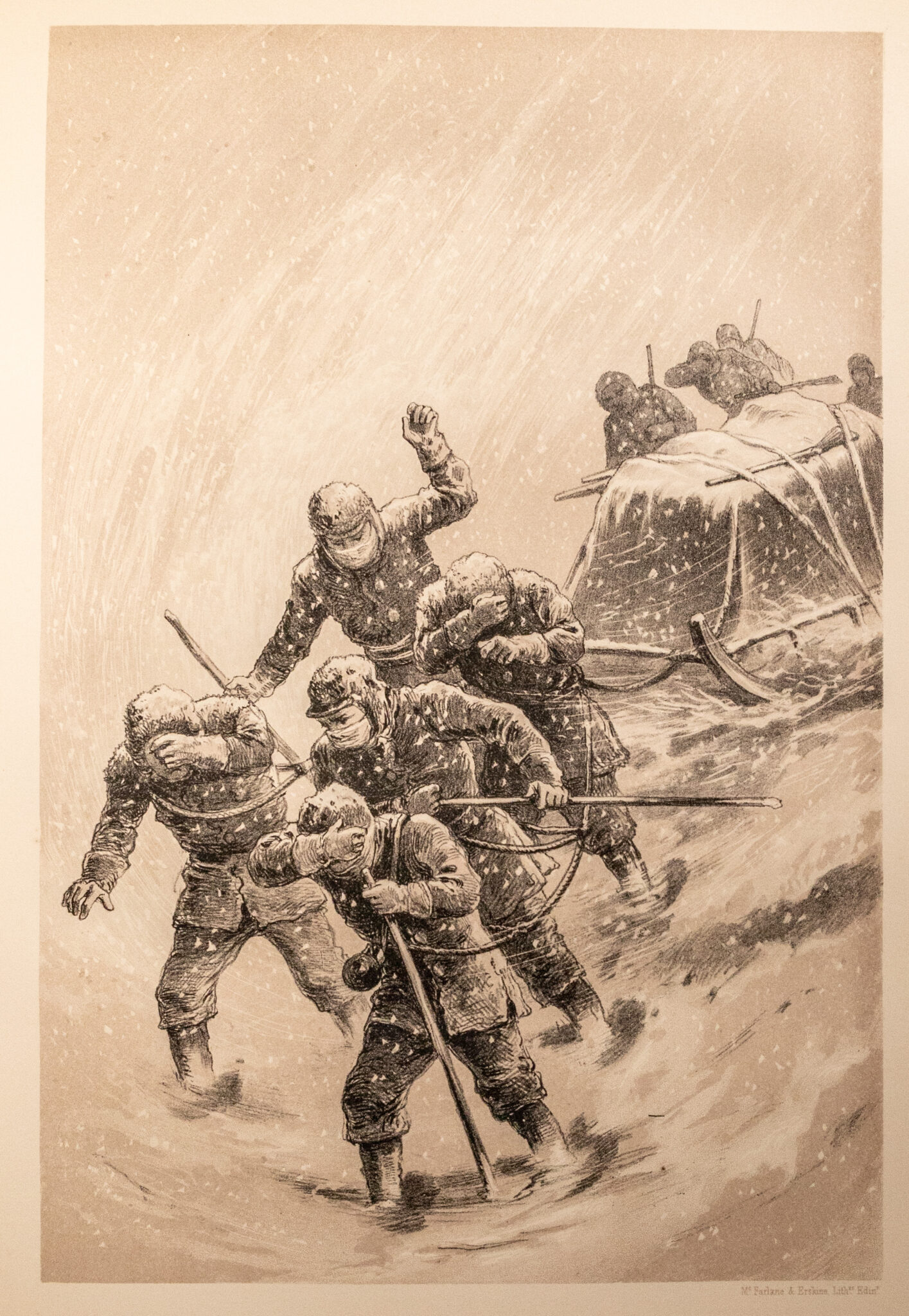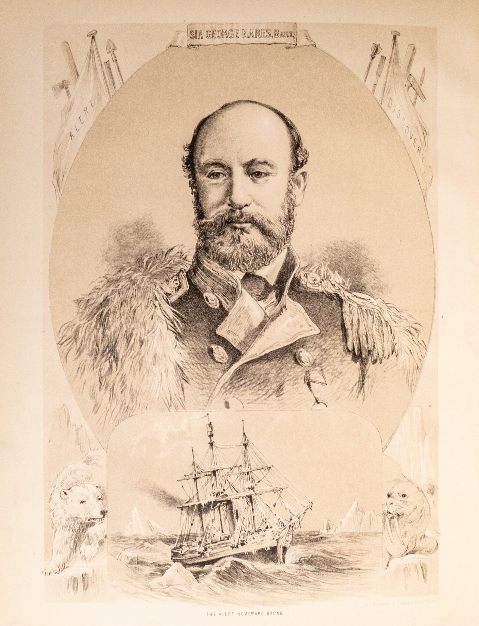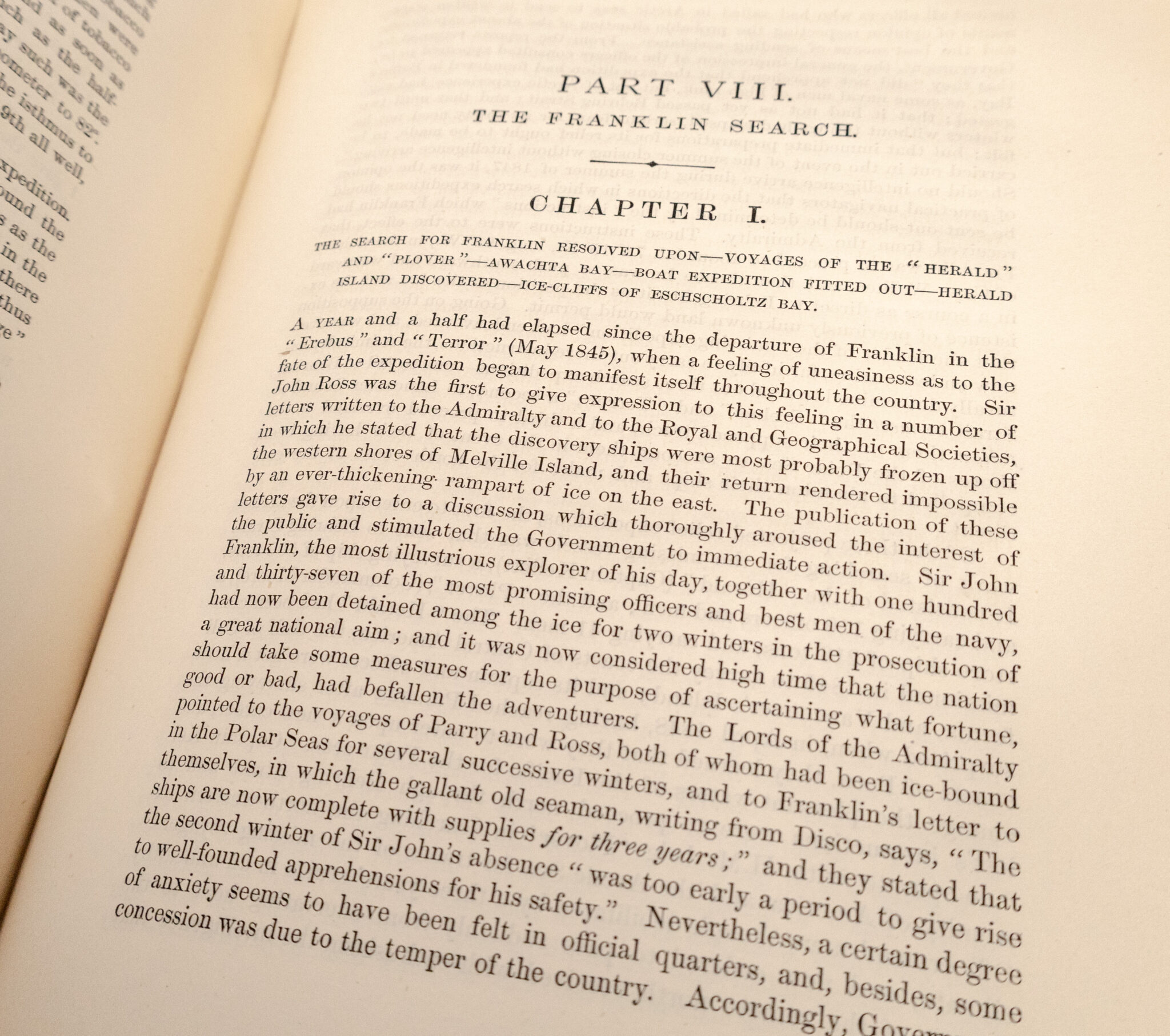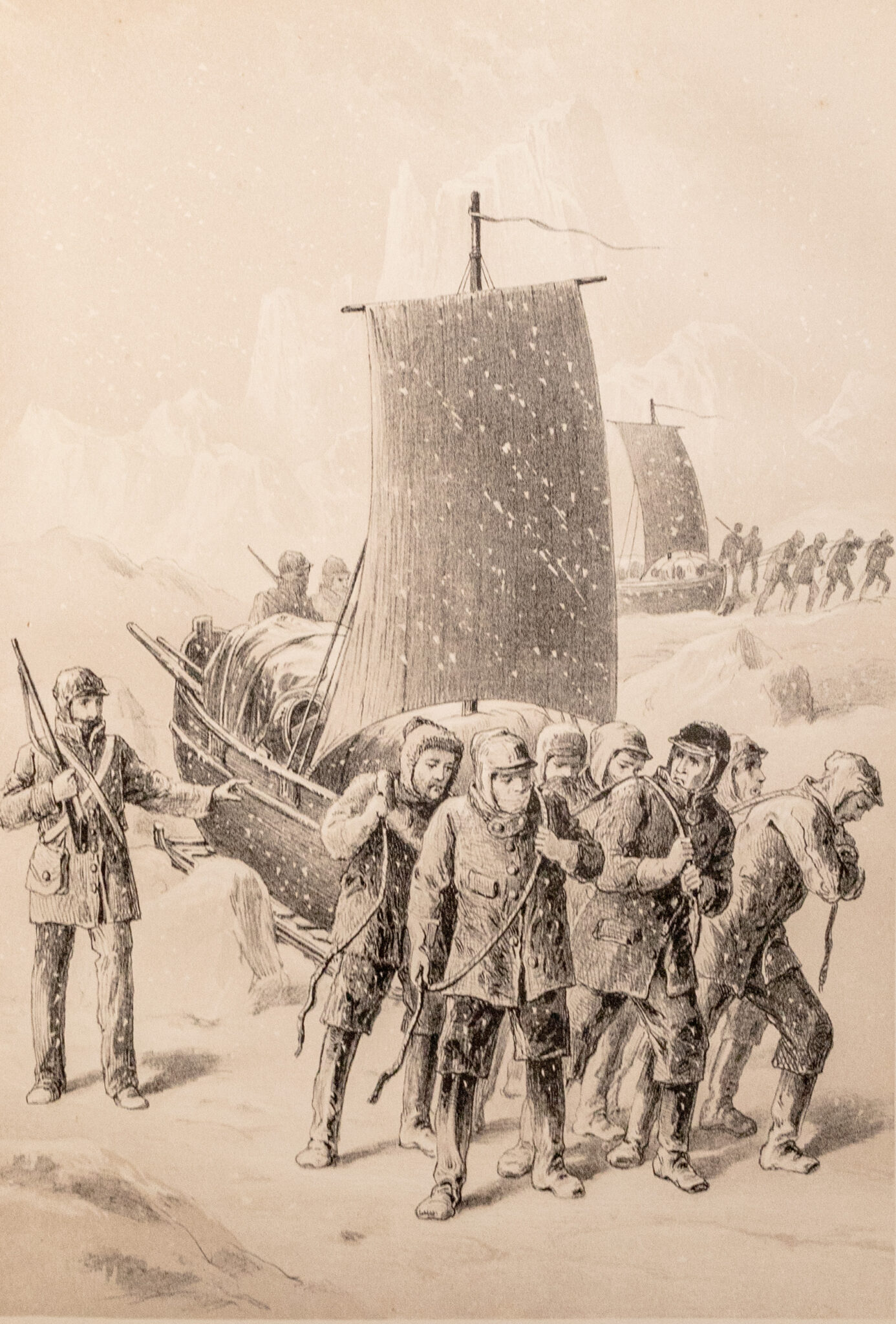 Finely bound edition of this history of Arctic exploration. Quarto, bound in full contemporary black morocco with gilt titles and elaborate tooling to the spine in six compartments within raised bands, elaborate pictorial front and rear panels stamped in blind and gilt, all edges gilt, rebacked with original spine laid down, tissue-guarded frontispiece. Illustrated with 24 full page plates including two in color and two folding maps. In very good condition. A handsomely bound example.