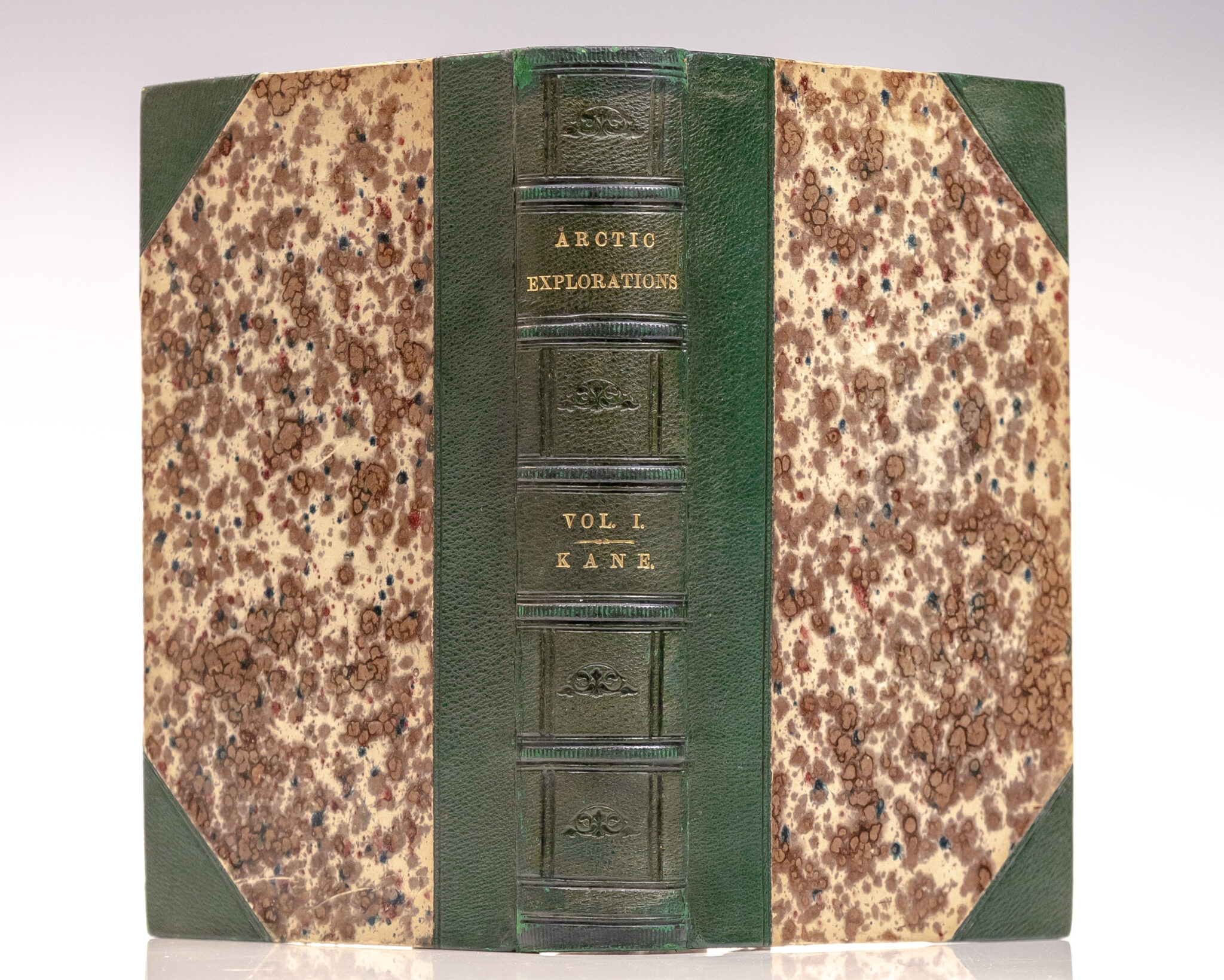 First edition of this firsthand account to search for the lost British explorer Sir John Franklin. Octavo, two volumes, bound in contemporary three quarters close-grain green morocco over marbled boards with gilt titles and tooling to the spine in six compartments within raised bands, all edges marbled, marbled endpapers, tissue-guarded frontispieces, separate title page vignettes, illustrated with over 300 engravings on steel and wood from sketches by the author, including 20 full page plates and four maps including two folding. First printing issue point of "Open Sea" rather than "Kane's Sea" on map in volume one. In near fine condition. A very sharp set.