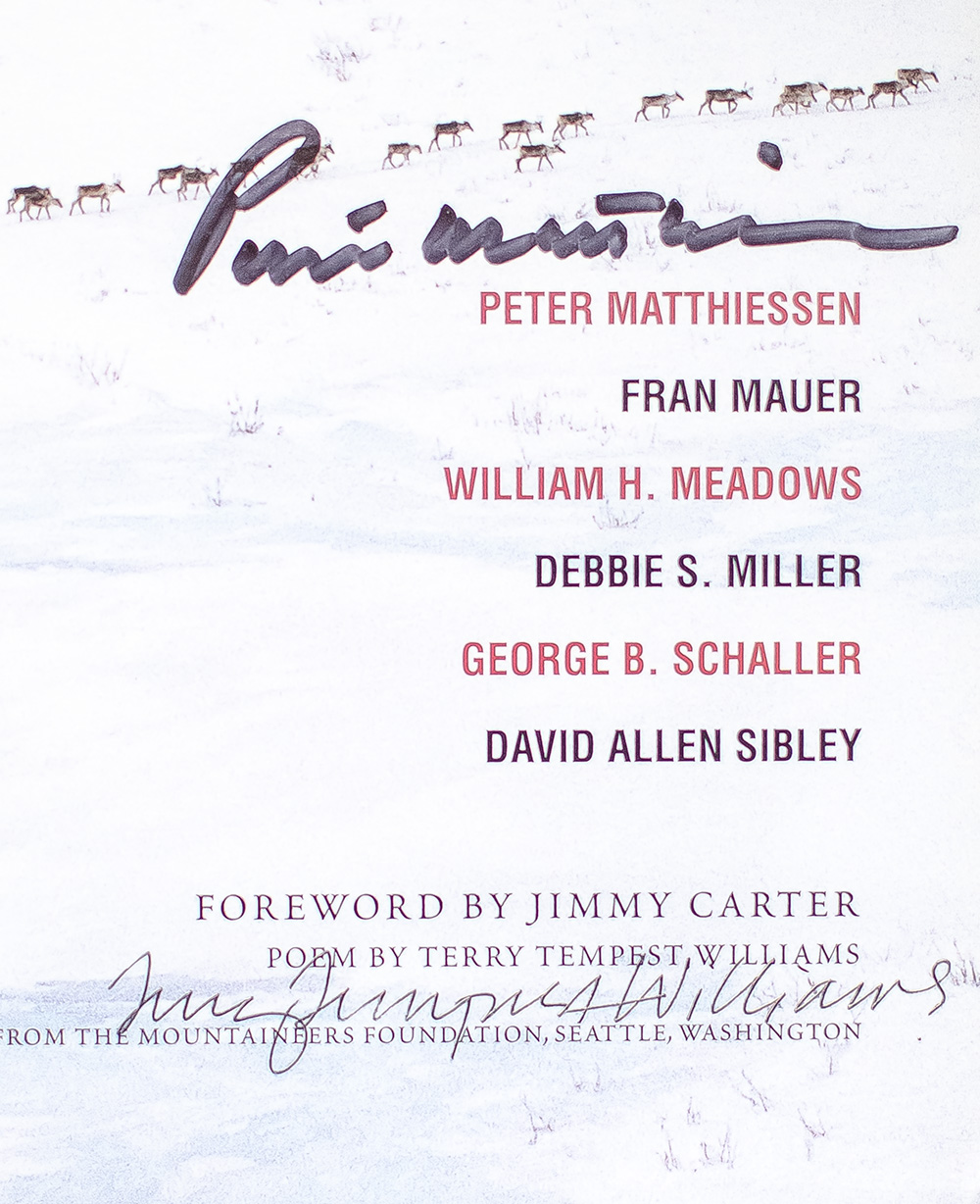 First edition of the most comprehensive, photographic documentation of the biodiversity and indigenous cultures of the Arctic National Wildlife Refuge. Quarto, original cloth, illustrated. Boldly signed by Peter Matthiessen and Terry Tempest Williams on the title page. Fine in a near fine dust jacket. Uncommon signed.