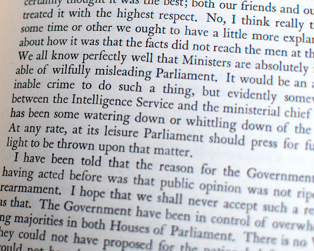 All but two of the speeches gathered in this volume were delivered by Winston Churchill in the House of Commons during the tense years preceding the Second World War. Compiled by his son, Randolph Churchill, and later revised by Churchill himself, these speeches exemplify the rhetorical mastery of a statesman who, as Langworth notes, devoted more time than any other modern orator to the preparation of his speeches" (Langworth, 190). "The finest (and most ominous) pre-war warning of Winston Churchill occurs on [its] penultimate page… Available in no other Churchill book… the last four paragraphs of that famous speech on 24 March 1938… summarize the theme of this volume, a precursor to the official theme of The Gathering Storm: 'How the English-speaking peoples through their unwisdom, carelessness, and good nature allowed the wicked to re-arm" (Langworth, 190).