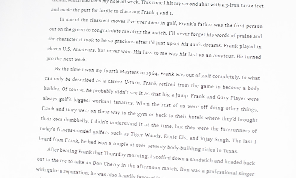 An illustrated self-portrait is a collection of personal and professional anecdotes that recount many of the golf icon's experiences in an accessible manner, in a volume complemented by twelve removable facsimiles of such personal items as a tip card on how to work around various golf challenges, a letter from Eisenhower repaying a bet, and a winning USGA 1960 U.S. Open scorecard.