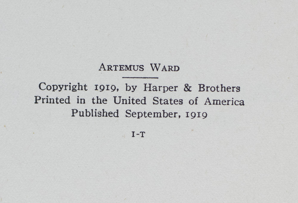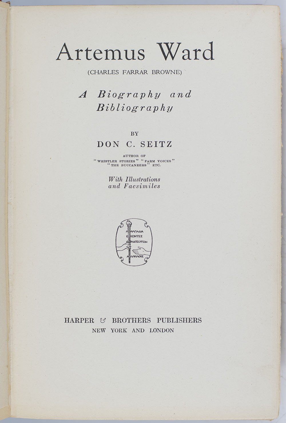 First edition of Don Seitz's Artemus Ward; inscribed by him to Harry Houdini and with Houdini's ownership signature