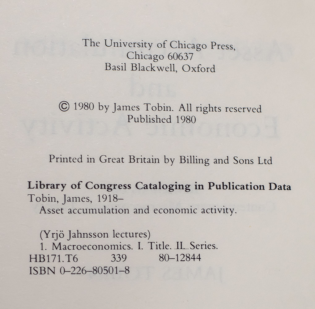 First Edition of James Tobin's Asset Accumulation and Economic Activity: Reflections on Contemporary Macroeconomic Theory