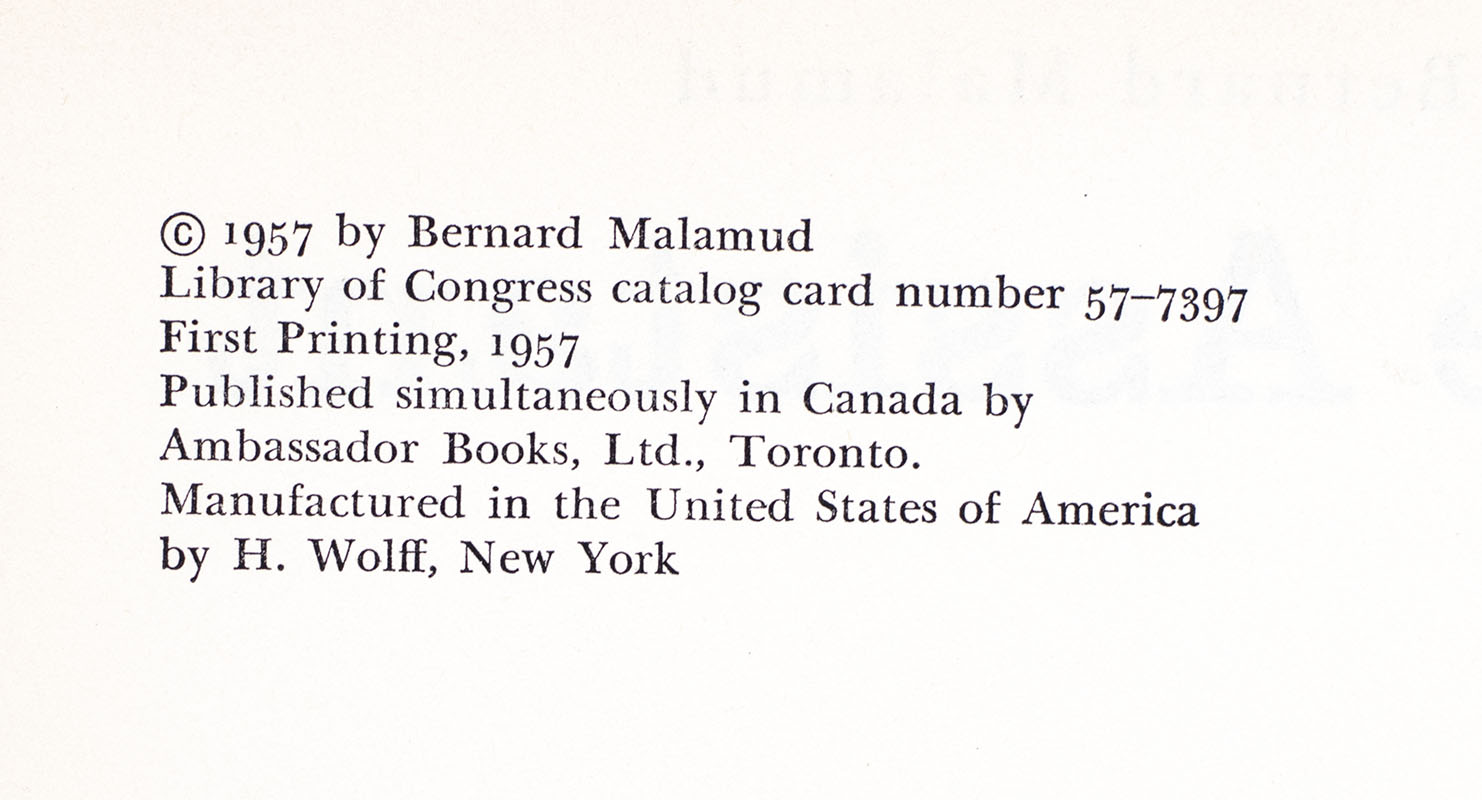 First edition of Malamud's second novel, which went on to win the Daroff Fiction Award from the Jewish Book Council of America and the Award of the National Institute of Arts and Letters. Octavo, original half cloth. Signed by Bernard Malamud on the half-title page. Near fine in a near fine dust jacket with a chip to the crown of the spine. Jacket design by Milton Glaser.