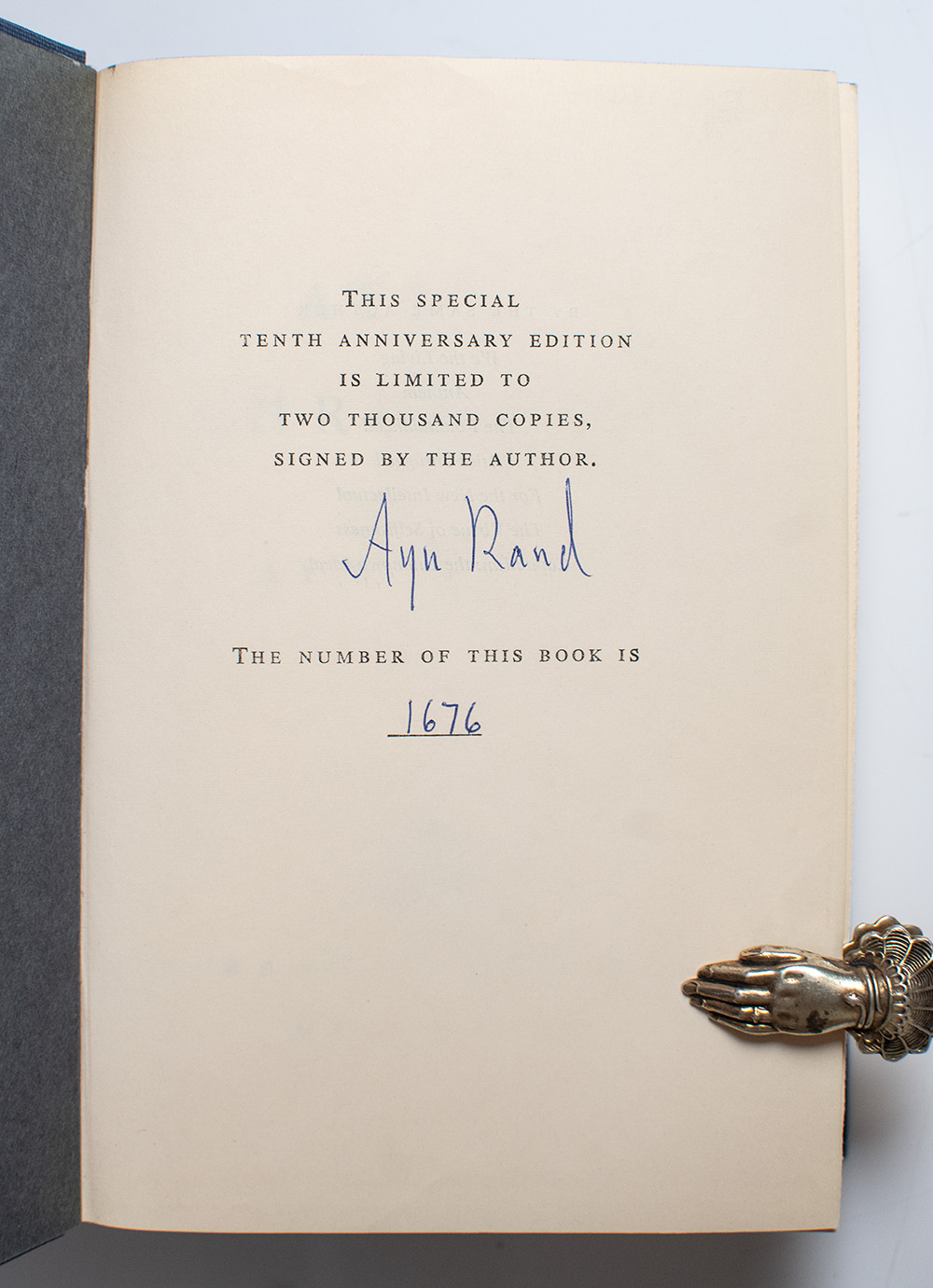 Tenth Anniversary edition; number 1676 of 2000 numbered and signed copies. Octavo, original blue cloth, top stain blue, original slipcase. Boldly signed by the author on the limitations page, "Ayn Rand." In fine condition. Housed in the original slipcase, in very good condition.
