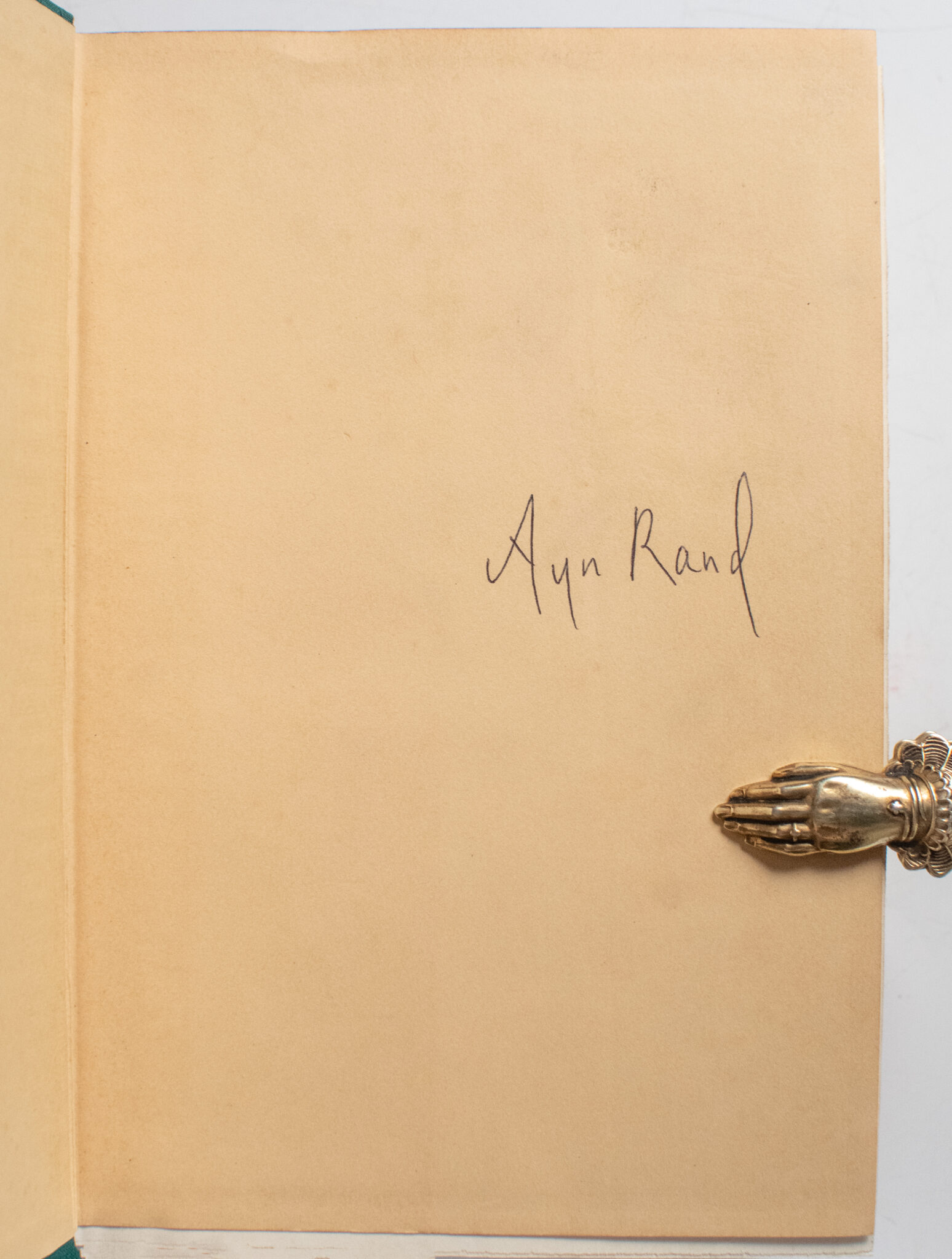 First edition of one of the most influential novels of the twentieth century. Large octavo, original green cloth, frontispiece stamped in gilt, spine stamped in black and gilt. Boldly signed by Ayn Rand on the front free endpaper. Near fine in a near fine dust jacket. Jacket design by George Salter.