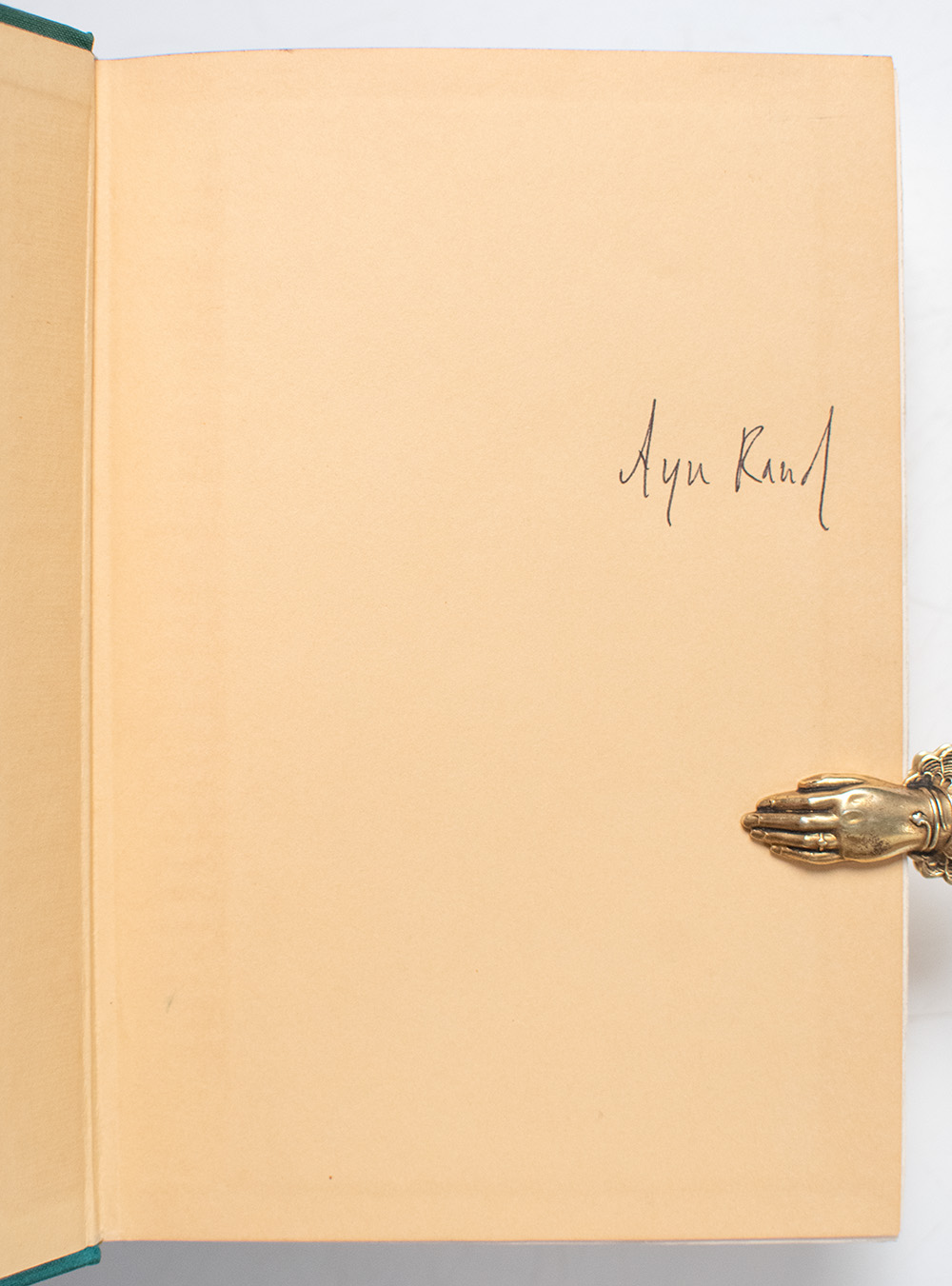 First edition of one of the most influential novels of the twentieth century. Large octavo, original green cloth, frontispiece stamped in gilt, spine stamped in black and gilt. Boldly signed by Ayn Rand on the front free endpaper. Near fine in a near fine price-clipped dust jacket. Jacket design by George Salter.