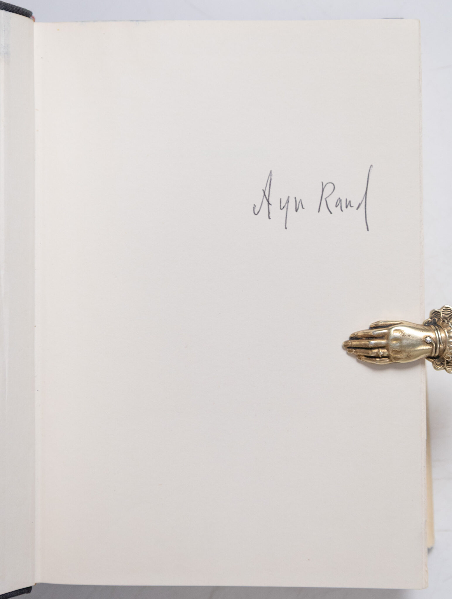 First edition, later printing of one of the most influential novels of the twentieth century. Large octavo, original half cloth. Boldly signed by Ayn Rand on the front free endpaper. Fine in a very good dust jacket. Jacket design by George Salter.