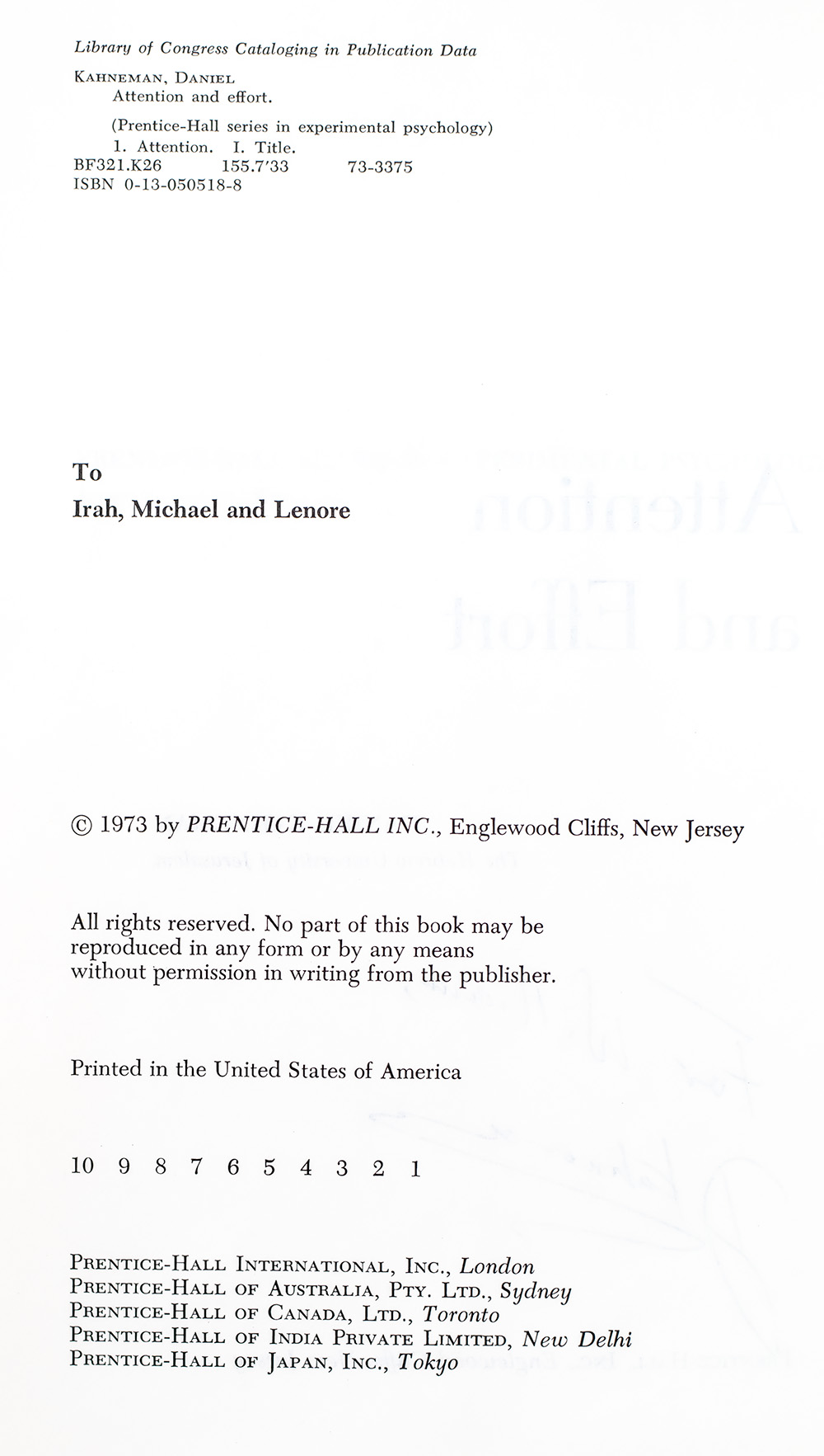 First Edition of Attention and Effort; Inscribed by Nobel Prize-Winning Economist Daniel Kahneman