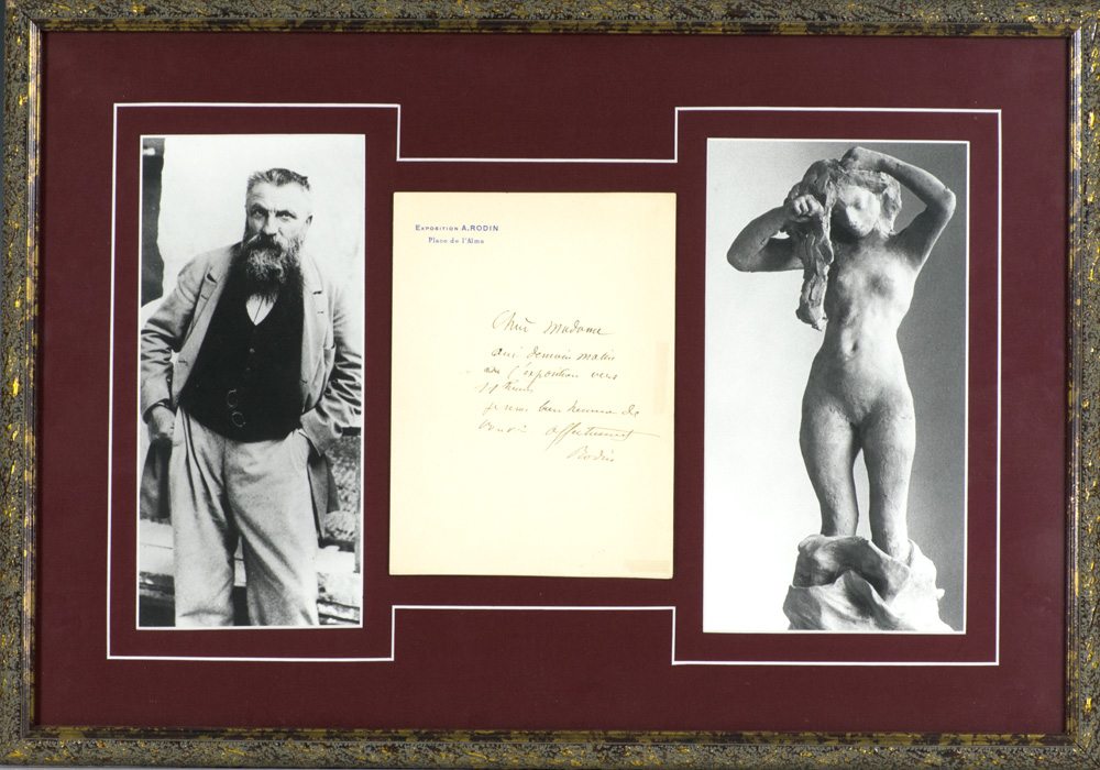 Autographed letter signed by August Rodin on Exposition A. Rodin Place de l'Alma letterhead. In full: "Hui madame, Oui demain matin l'exposition vers 11 heures. Je serai bonne heure de vour in. Affectueusement,  Rodin" which translates as: "Dear Madame, Yes, tomorrow morning the exposition starts at 11 am. At the right moment, I will see it. Affectionately, Rodin." Written the day before the opening of Rodin's first solo exhibition in France at the Pavillion de l'Alma in Paris, a space specially built for the exhibition in 1900 to coincide with the Exposition Universelle, or Paris World Fair. Matted and framed with a photograph portrait of Rodin and one of his clay-sculpted female nudes. The entire piece measures 14.5 inches by 20.75 inches.