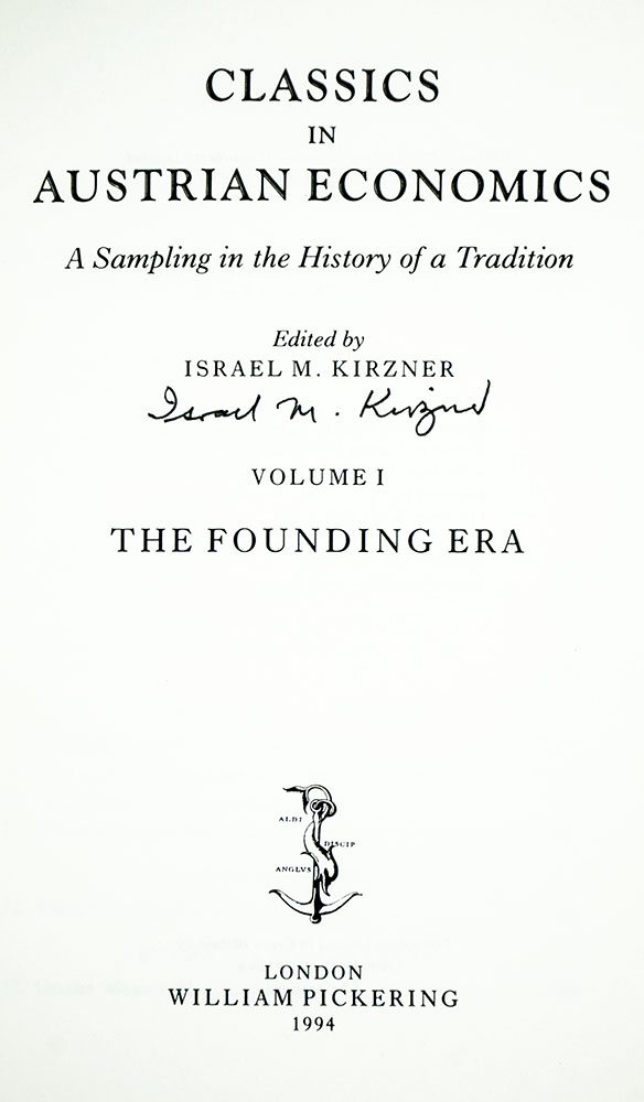 First editions of the collected works of the classics of Austrian economics. Octavo, original cloth, 3 volumes. Each volume is signed by Israel M. Kirzner on the title page. In fine condition. Edited by Israel M. Kirzner.