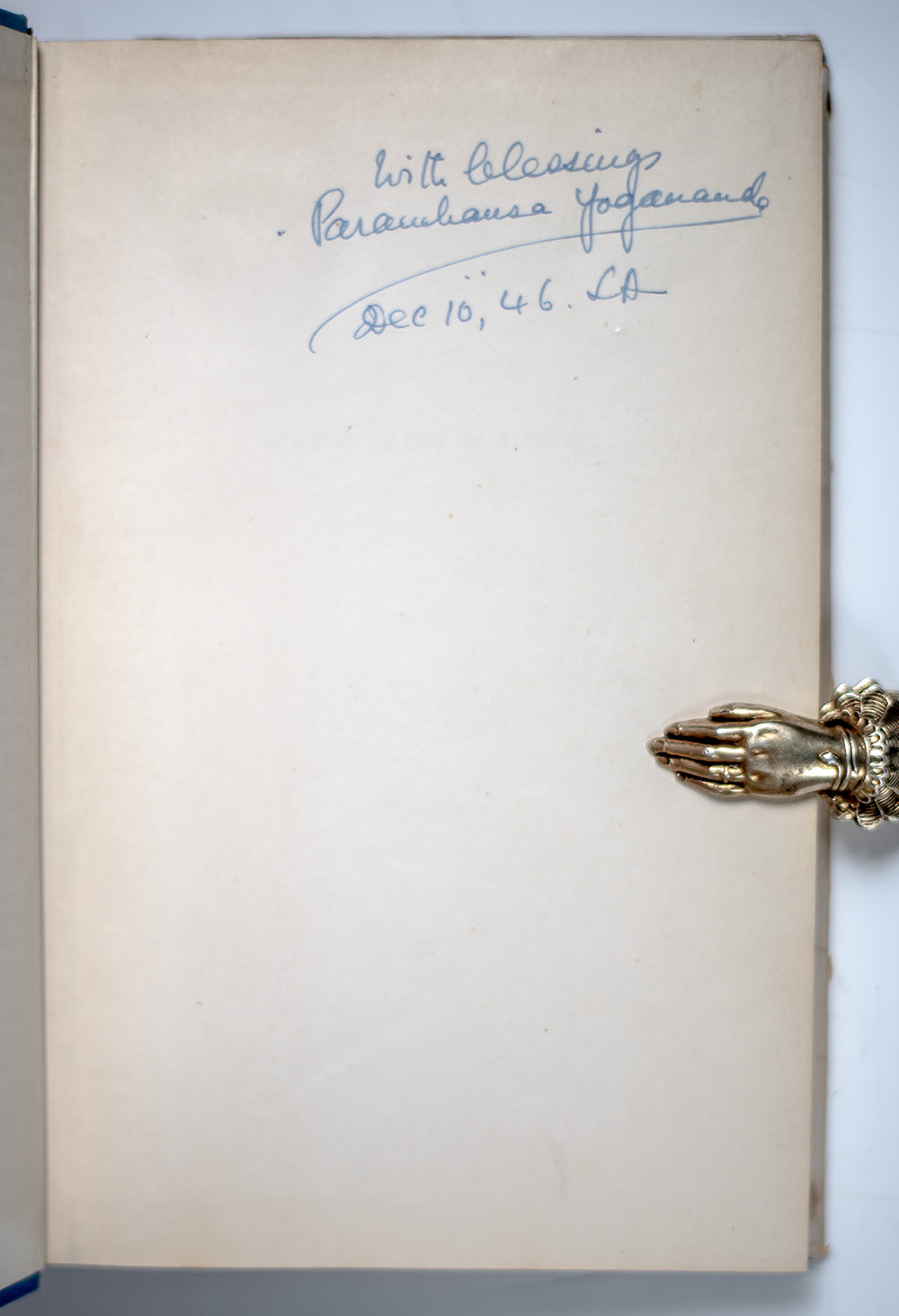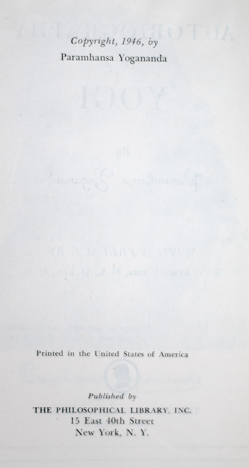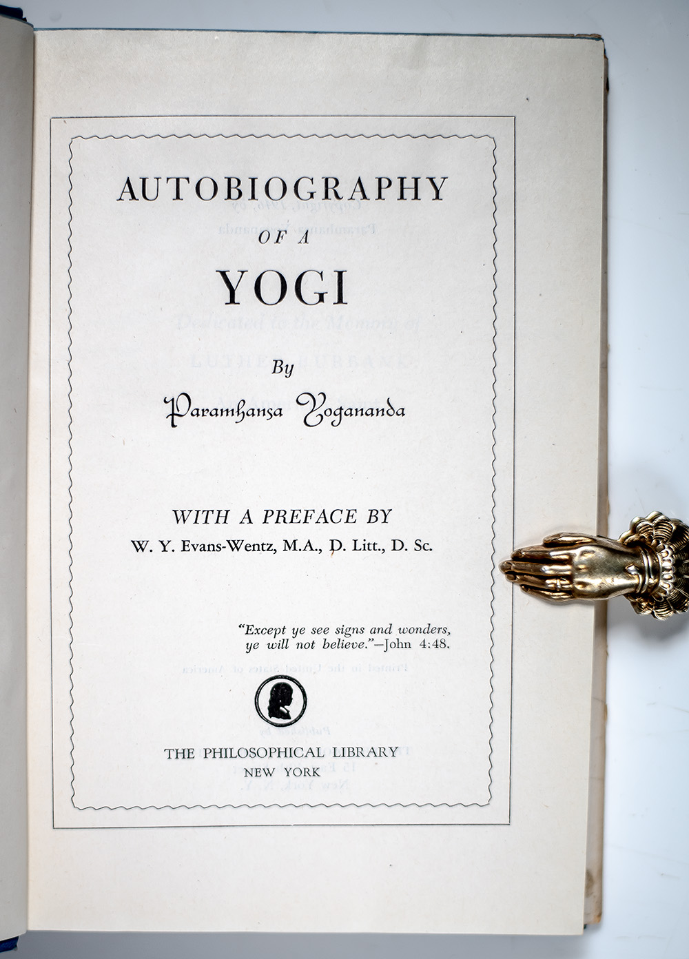 “The deeper the Self-realization of a man, the more he influences the whole universe by his subtle spiritual vibrations, and the less he himself is affected by the phenomenal flux": First Edition of Autobiography of A Yogi; Inscribed by Yogananda Paramhansa