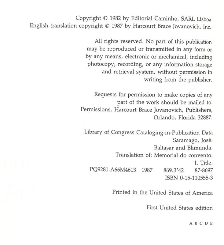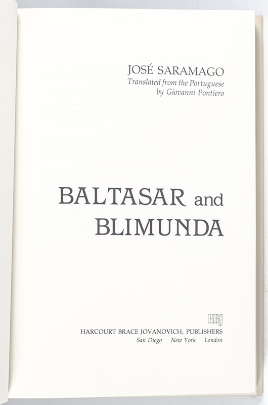 “There is nothing healthier for a man than to walk on his own two legs": First Edition of Baltasar and Blimunda; Inscribed by Jose Saramago