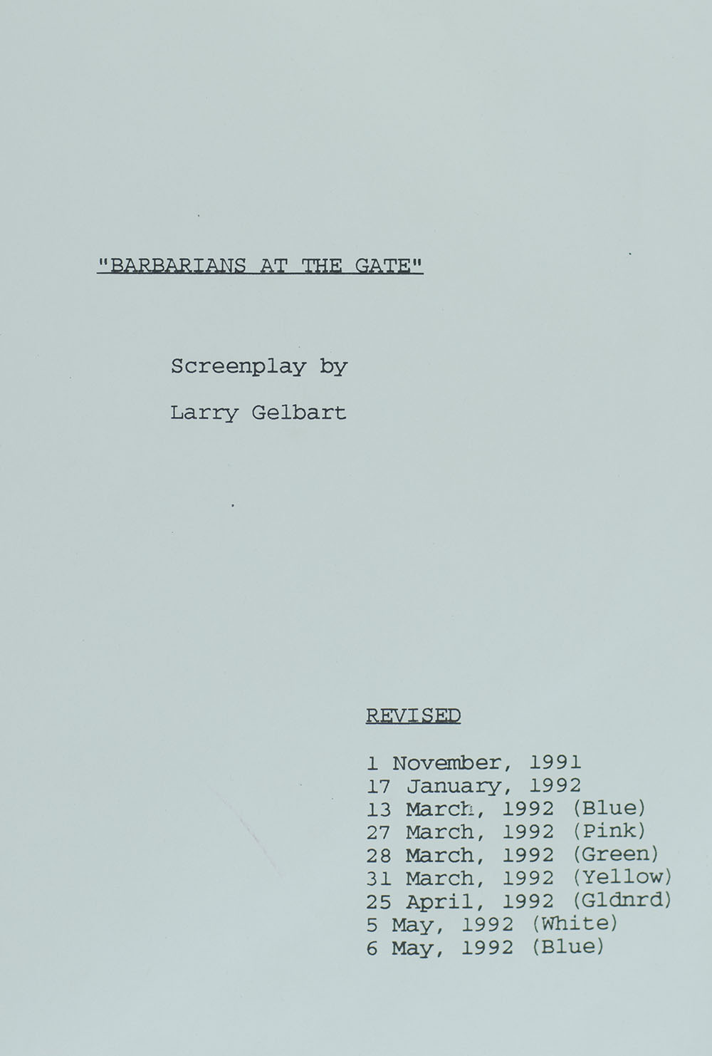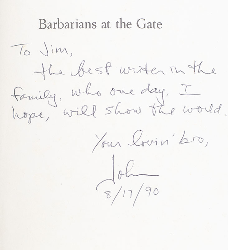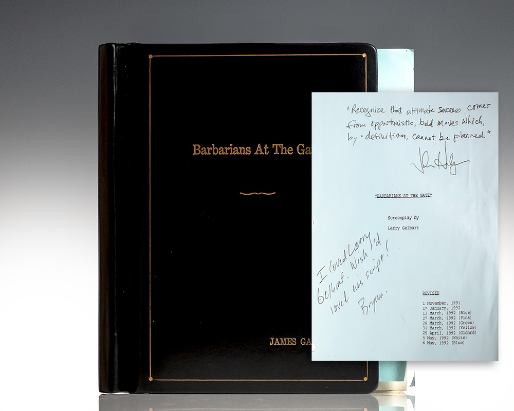 James Garner's original shooting script for the film in which he starred, Barbarians at the Gate. Quarto, bound in the original binder, with Garner's embossed name in gilt to the front panel. Lengthily signed by both authors on the title page, "I loved Larry Gelbart. Wish I'd loved his script! Bryan" and by co-author Helyar, "Recognize that ultimate success comes from opportunistic, bold moves which by definition, cannot be planned. John Helyar." Barbarians at the Gate was directed by Glenn Jordan and written by Larry Gelbart, based on the 1989 book of the same name by Bryan Burrough and John Helyar. The film stars James Garner, Jonathan Pryce, and Peter Riegert. It tells the true story of F. Ross Johnson, who was the president and CEO of RJR Nabisco. The film earned nine nominations at the 45th Primetime Emmy Awards, winning one for Outstanding Made for Television Movie. It also won Best Miniseries or Television Film and Best Actor in a Miniseries or Television Film for Garner at the 51st Golden Globe Awards. From the library of James Garner, with a signed note from his daughter laid in.