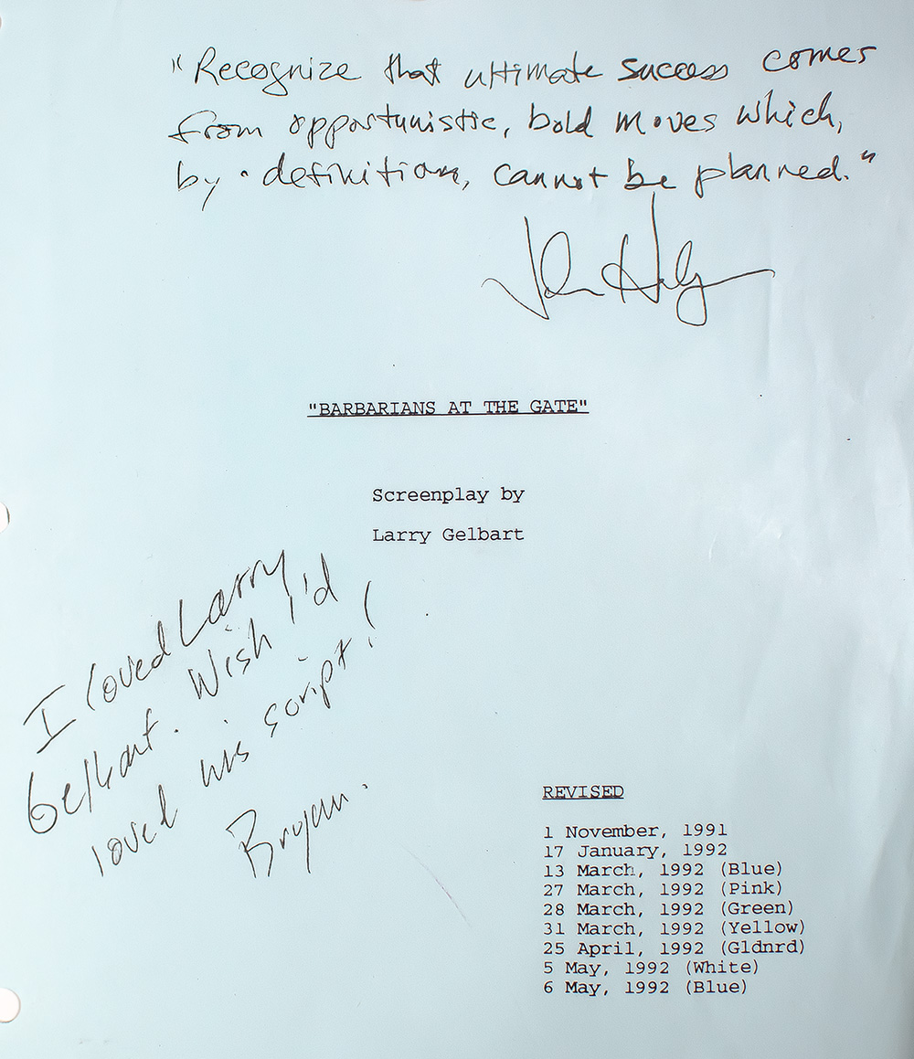 "Every penny you think I'm pissing away comes back to you dressed up like a nickel": James Garner's Original Shooting Script for Barbarians At The Gate, for which he starred; Lengthily Signed by both Bryan Burrough and John Helyar