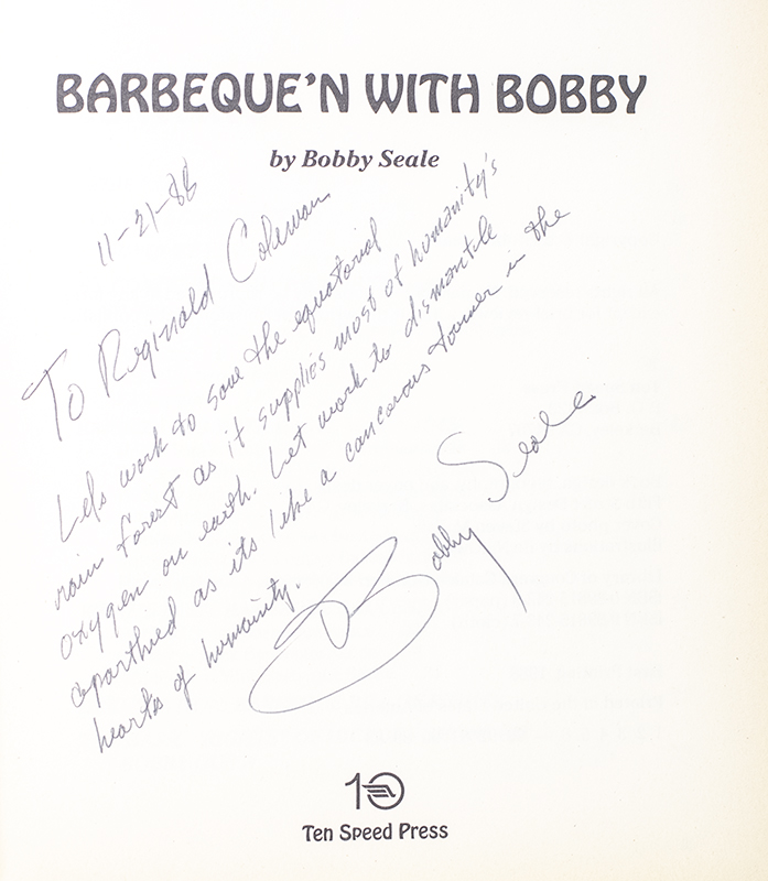 First edition the co-founder of the Black Panther Party's classic 'Down-Home' Barbeque cookbook. Quarto, original boards. Presentation copy, inscribed by the author on the title page in the year of publication, "11-21-88 To Reginald Coleman Let's work to save the equatorial rain forest as it supplies most of humanity's oxygen on earth. Let's work to dismantle apartheid as its like a cancerous tumor in the hearts of humanity. Bobby Seale." In fine condition. A unique example, rare and desirable with such an impassioned inscription from the famed co-founder of the Black Panther Party.