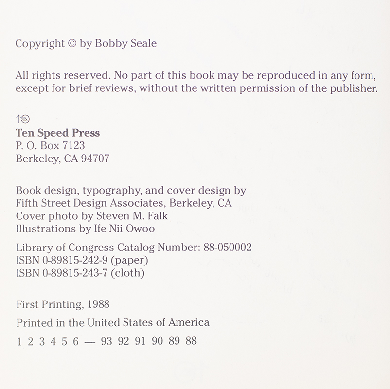 In 1966, American political activist and author Bobby Seale co-founded the Black Panther Party with fellow activist Huey P. Newton. Founded as the "Black Panther Party for Self-Defense", the Party's main practice was monitoring police activities and challenging police brutality in Black communities, first in Oakland, California, and later in cities throughout the United States. Seal published several books throughout his lifetime, including: A Lonely Rage: The Autobiography of Bobby Seale, Seize the Time: The Story of the Black Panther Party and Huey P. Newton, and Power to the People: The World of the Black Panthers.