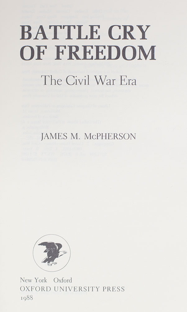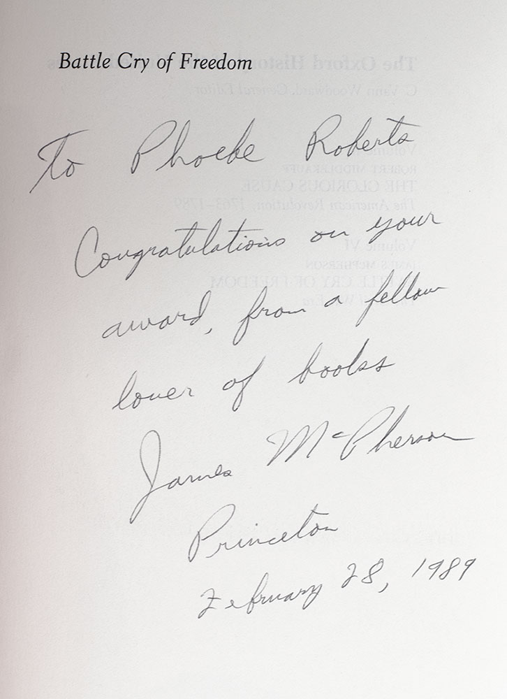 First edition, early printing of the author's Pulitzer Prize-winning work. Octavo, original blue cloth, illustrated. Presentation copy, inscribed by the author on the half-title page, "To Phoebe Roberts Congratulations on your award, from a fellow lover of books James McPherson Princeton February 28, 1989." Near fine in a near fine dust jacket. Jacket design by Honi Werner.