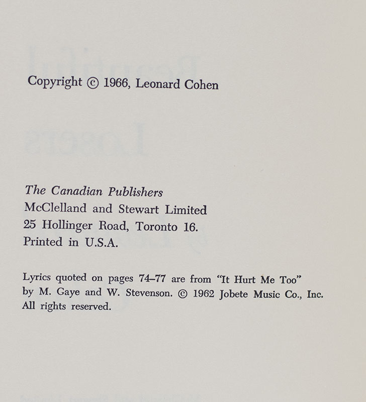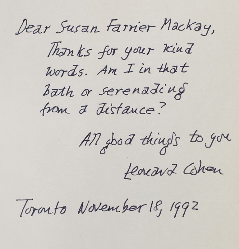 First edition of Cohen's second and final novel. Octavo, original cloth. Presentation copy, warmly inscribed by the author on the front free endpaper, "Dear Susan Farrier MacKay, Thanks for your kind words. Am I in that bath or serenading from a distance? All good things to you Leonard Cohen Toronto November 18, 1992." Near fine in a near fine dust jacket. Jacket drawing by Harold Town. Jacket design by Frank Newfeld. With a letter from the recipient laid in mentioning how she sent a letter to Cohen fantasizing of sitting in a bubble bath, drinking champagne and listening to Cohen sing I'm Your Man. An exceptional inscription.