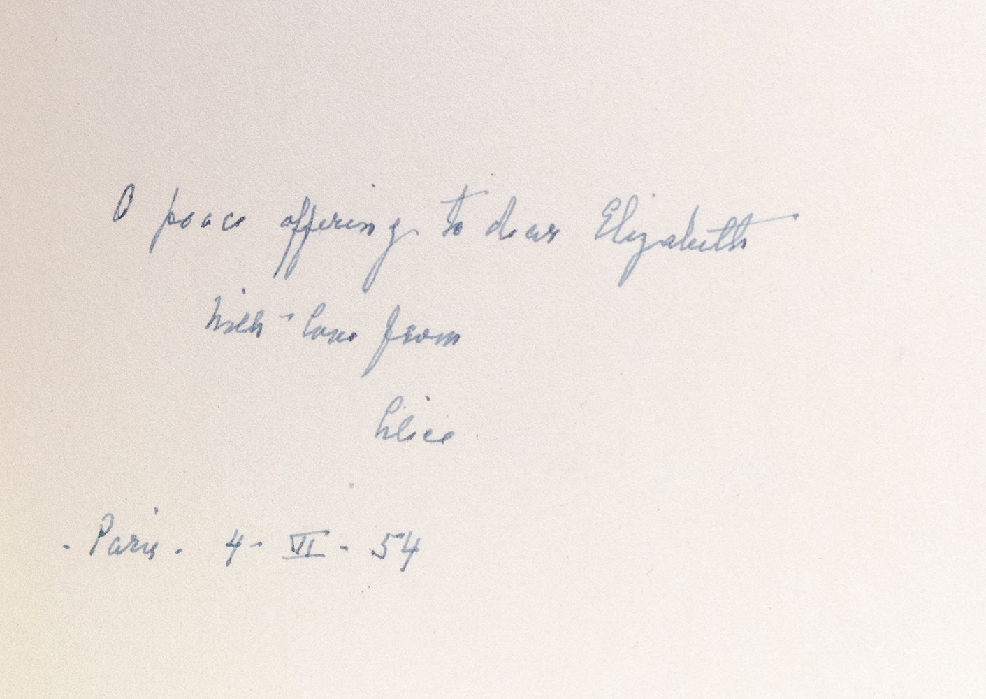 First edition of volume three of the Yale edition of Stein's unpublished writings, collected under the general editorship of Carl Van Vechten. Octavo, original boards. Presentation copy, inscribed by Stein's partner Alice B. Toklas on the front free endpaper, "A peace offering to dear Elizabeth with love from Alice Paris 4 - VI - 54." The recipient, Elizabeth Miriam Squire Sprigge was an English biographer and longtime nemesis of both Stein and Toklas and one of Stein's harshest critics. In several letters to close personal friends following Stein's death, Toklas expressed her disdain towards Sprigge, on one occasion in particular when she asserted to Sylvia Beach that Toklas was surely the true writer of Stein's work (Toklas, Staying on Alone). Toklas sent the first edition of the posthumous work to Sprigge as a sort of peace offering in the midst of the feuding, however, she late rescinded all kind gestures with the 1957 publication of Sprigge's Gertrude Stein: Her Life and Work which proved to be contentious, "vulgar and mistaken" according to Toklas. Laid in is a photograph of Stein's grave and a sealed envelope containing “horse hair from sofa rue Christine [Stein's home]” and “thorns from rose bush at Bellingen." Near fine in a very good dust jacket.