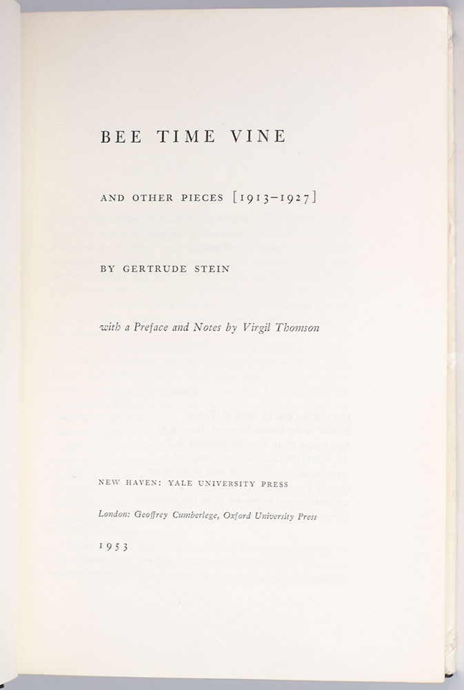 First edition of Gertrude Stein's Bee Time Vine; inscribed by her life partner Alice B. Toklas to long-standing nemesis Elizabeth Sprigge