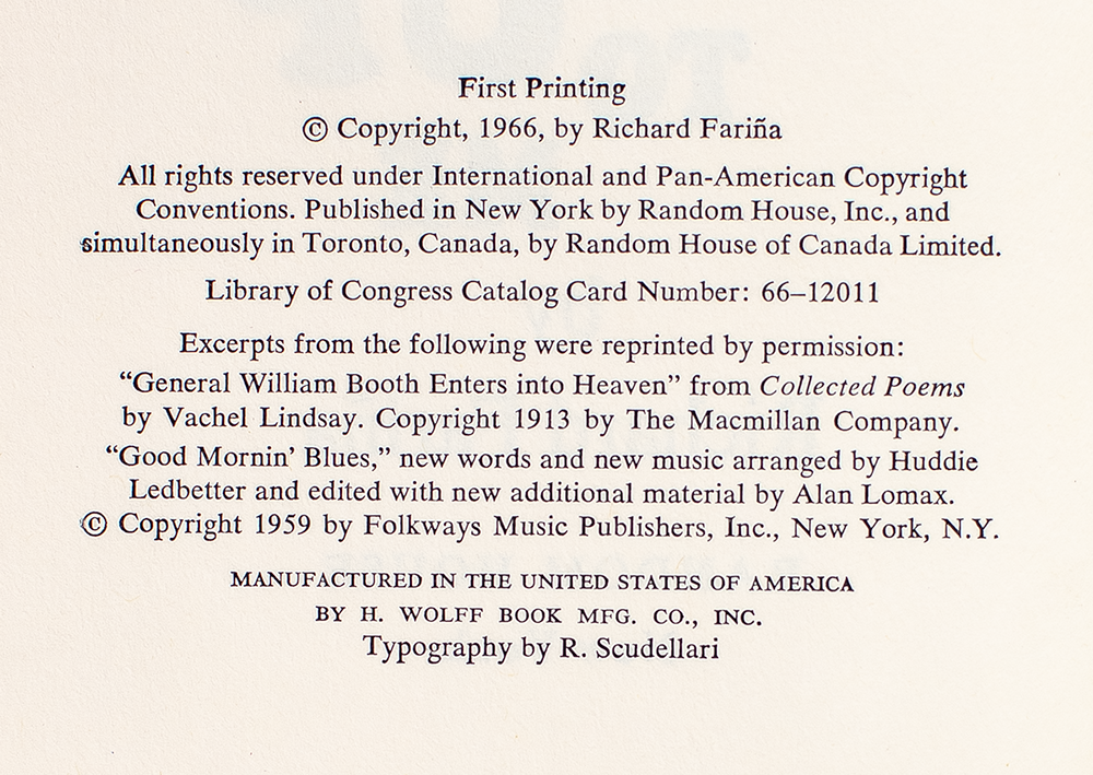 First edition of the author and songwriter’s first novel, warmly praised by his friend Thomas Pynchon; the only novel published in Fariña’s lifetime, as he tragically died in a motorcycle accident two days after its publication. Octavo, original half green cloth. Presentation copy, inscribed by the author in the month of publication with a drawing of a flower on the front free endpaper, "for Virginia -Richard Farina, April 1966." The recipient, Virginia Freeman was a folk art dealer, who lived in California in the 1960s and later opened the Virginia Freeman Art Gallery in Destin, Florida. Very good in a very good dust jacket. Laid in are two articles about the book, one from the April 27, 1966 issue of the Carmel Valley Outlook advertising the release party of the book at the Thunderbird Shop, and the other an obituary of Farina by Stan Cloud. Exceptionally rare signed and inscribed.