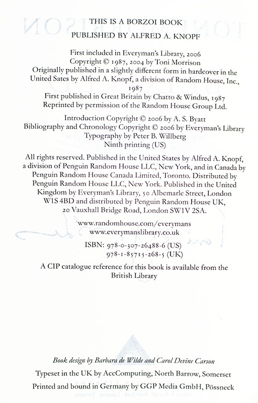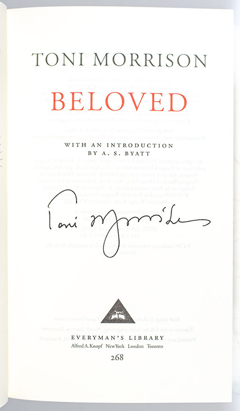 Early printing of the Everyman's library of the author's fourth novel and considered by many her finest. Octavo, original cloth. Signed by Toni Morrison on the title page. Fine in a fine dust jacket.