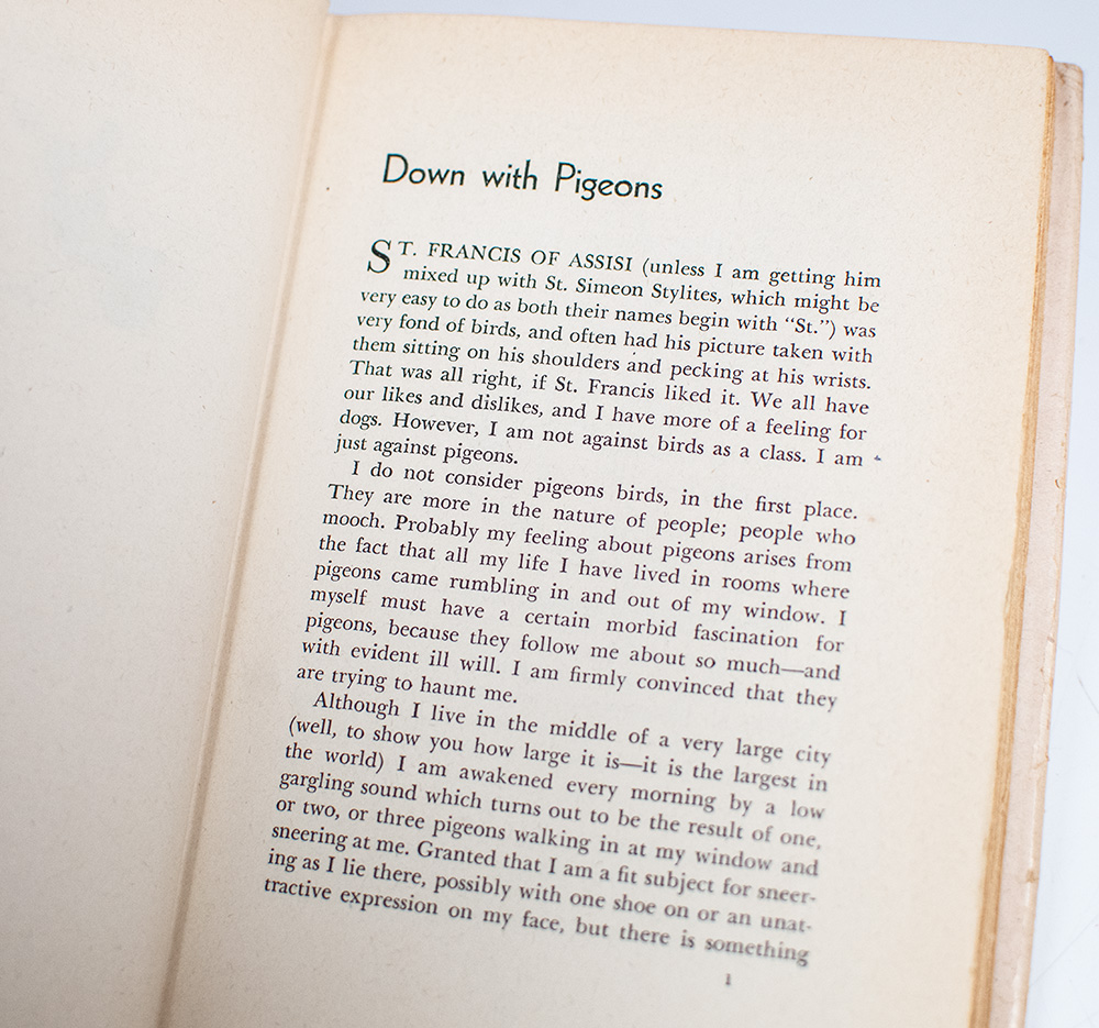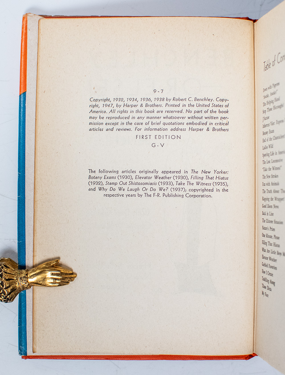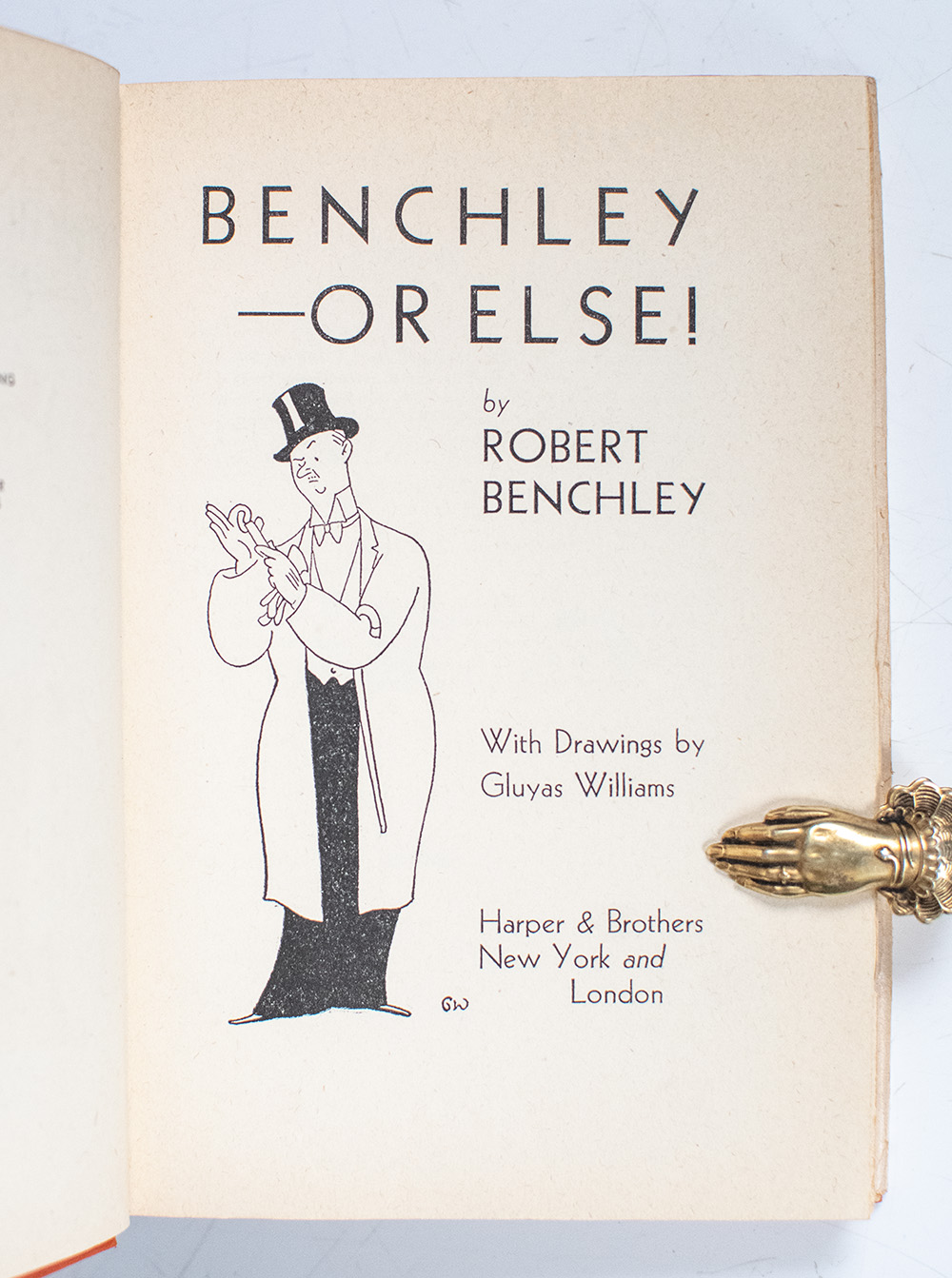 First edition of Benchley's collection of humorous essays. Octavo, original cloth, bookplate to the front pastedown from "The Library of Robert B. Gray." Illustrated with unique drawings by Gluyas Williams. Very good in a very good dust jacket. Author photograph by Ben Pinchot.
