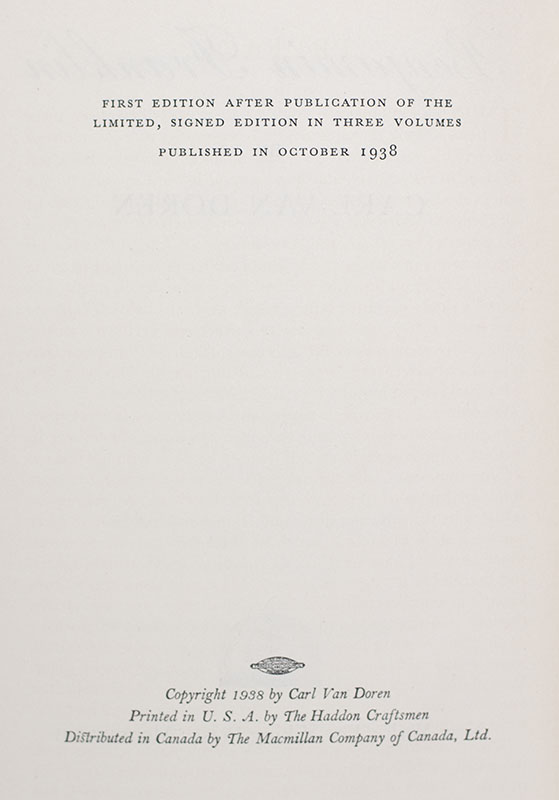 First Edition of the Author’s Classic Work on Benjamin Franklin; Signed by Carl Van Doren