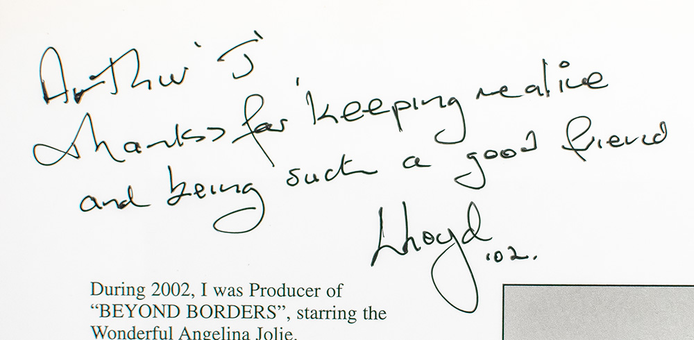 First edition of this collection of photographs taken during the filming of Martin Campbell's 'Beyond Borders,' starring Angelina Jolie. Oblong octavo, original pictorial wrappers, illustrated with black and white photographs throughout. Presentation copy, inscribed by the author on the dedication page, "Arthur 'J', Thanks for keeping me alive and being such a good friend. Lloyd '02." In very good condition. Accompanied by approximately eighty original gelatin silver prints. Many of these photographs are represented in the book, but there are many additional photographs not included in the book which appear here.