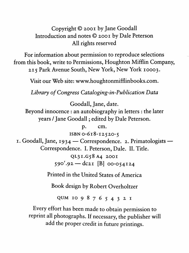 This second volume of Jane Goodall's autobiography in letters covers the years of many of her greatest triumphs and deepest tragedies. "Africa in My Blood" told of a young woman finding her life's work in the place of her dreams. "Beyond Innocence" tells of the events that shattered many of those dreams and changed Jane Goodall from a rather private observer to a public crusader. "What shines through these wonderful letters is kinship with the animals as well as a deep love for the job of getting to know them - one rarely gets such an intimate view of an obvious truth, that the wellspring of great science is passion" (Frans B.M. De Wall).