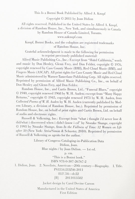 “Memory fades, memory adjusts, memory conforms to what we think we remember": First Edition of Blue Nights; Signed by Joan Didion