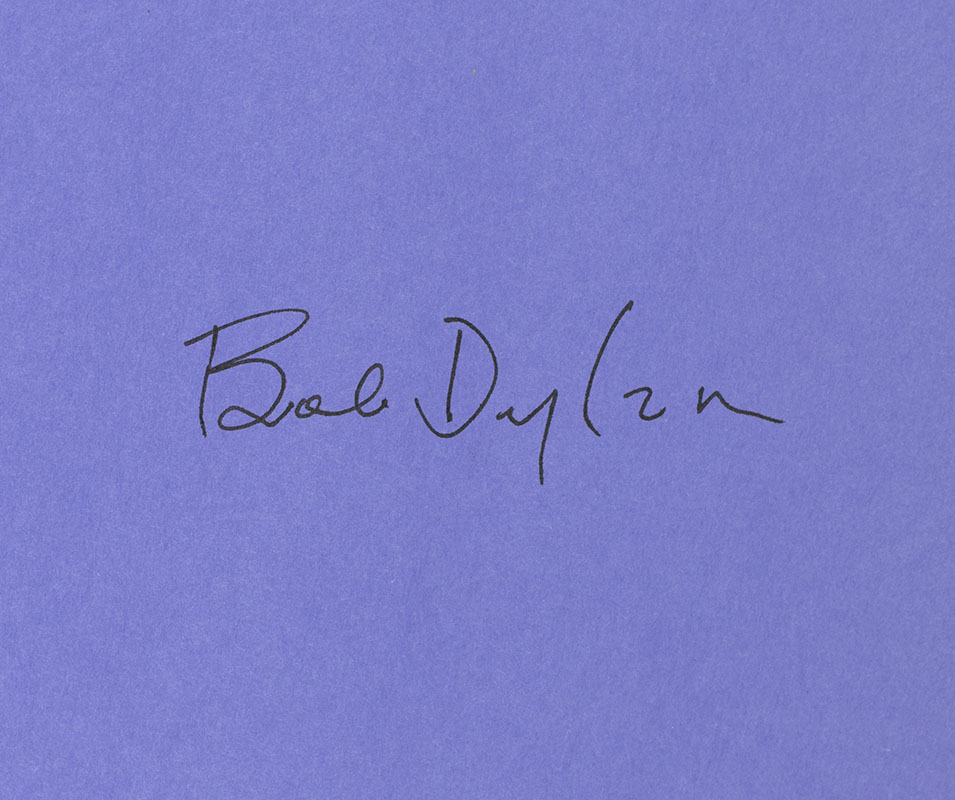 First edition of this collection of the Nobel Prize-winning author's lyrics from 1962-2001. Quarto, original half cloth. Signed by Bob Dylan on the title page. Fine in a fine dust jacket. Jacket design by Geoff Gans. Jacket photograph by Jerry Schatzberg. Signed by Dylan in Sweden in 2017.