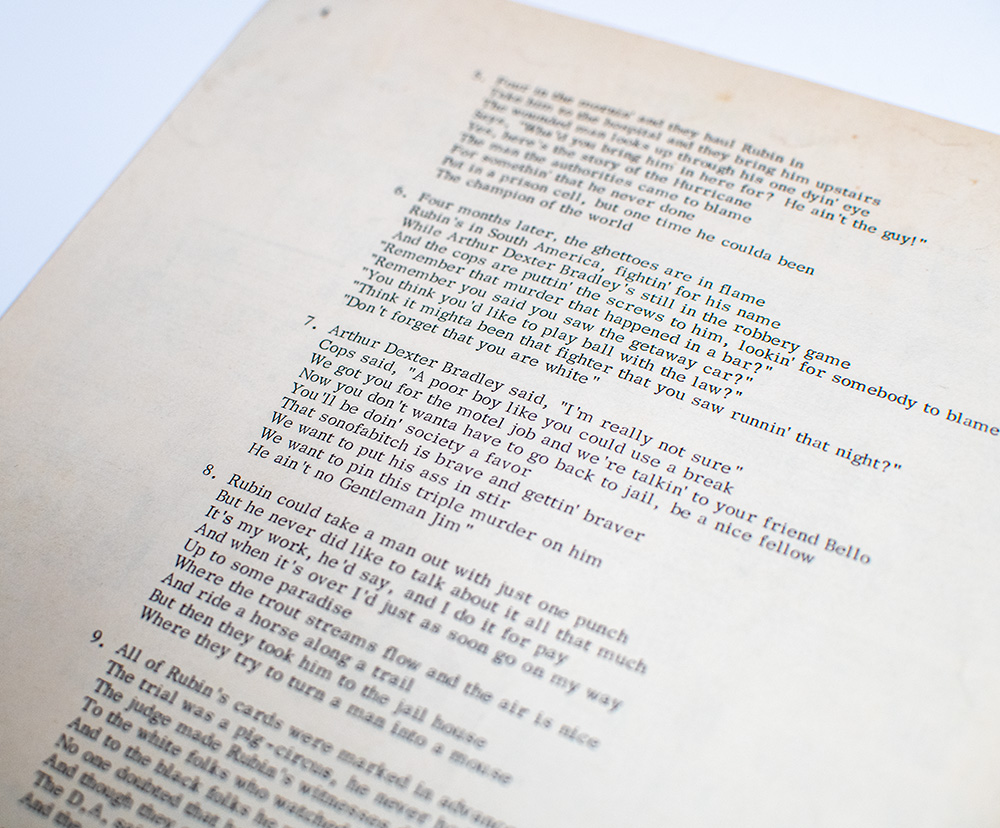 "That's the story of the Hurricane but it won't be over till they clear his name": Sheet Music For Hurricane by Bob Dylan and Jacques Levy; signed by Bob Dylan