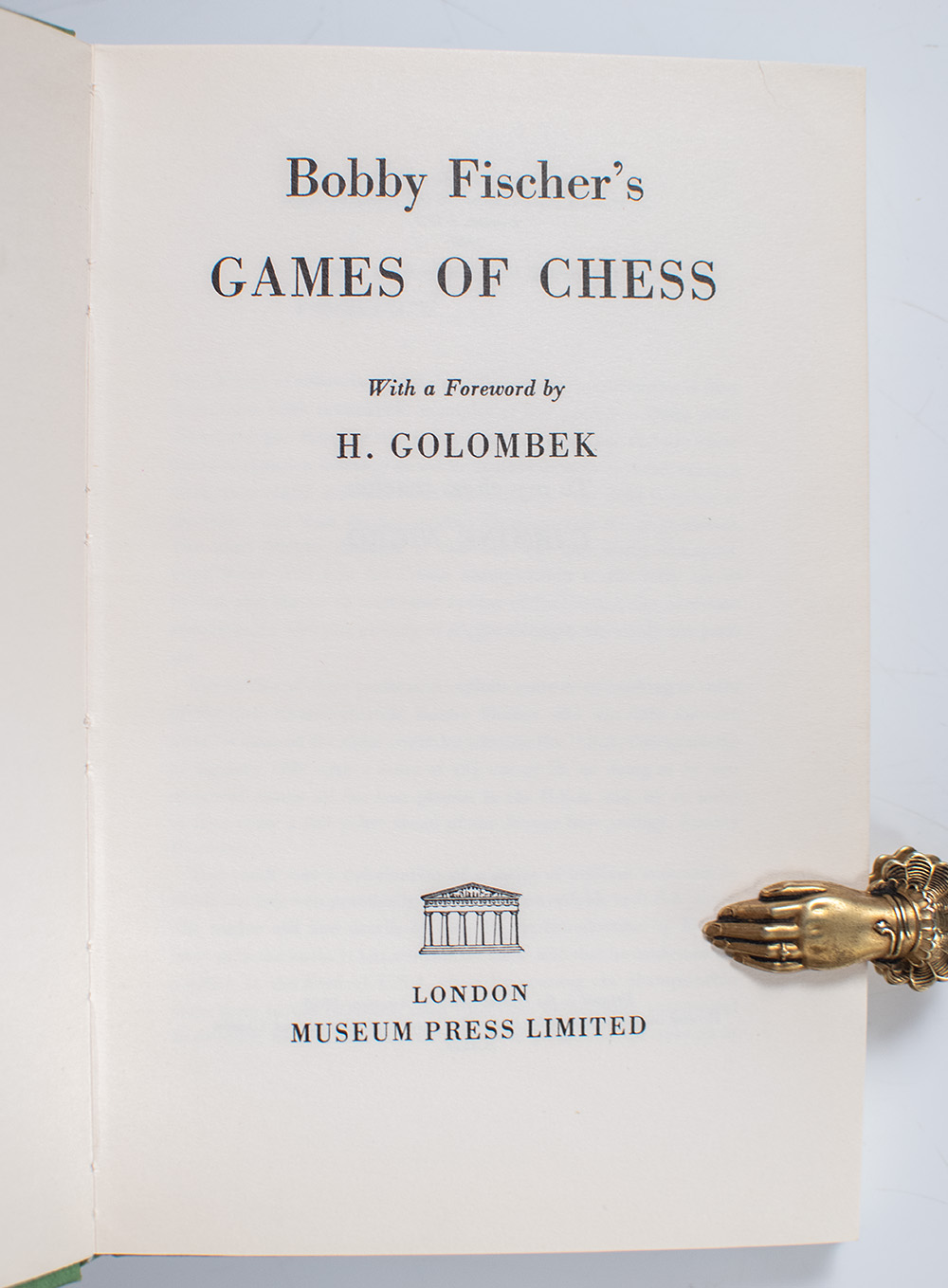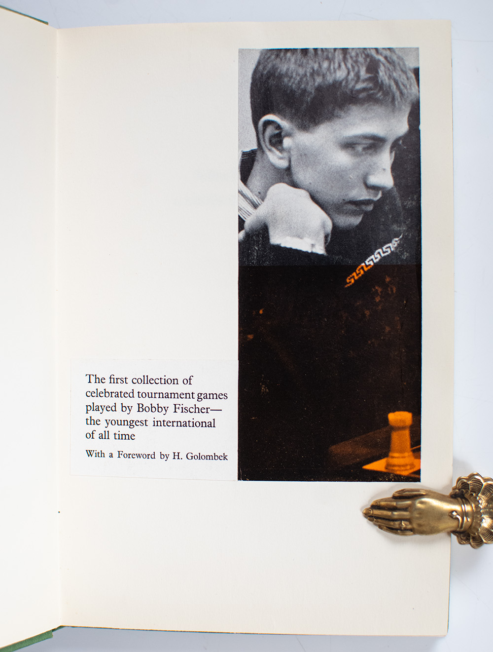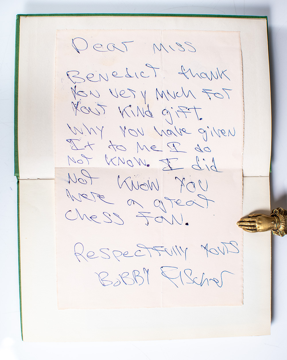 First British edition of the only book ever written entirely by Bobby Fischer. Octavo, original green cloth, illustrated, with a paper clipping and photograph of Fischer adhered to the third free endpaper. In fine condition. Accompanied by an autograph letter signed by Fischer and affixed to the verso of the front free endpaper. Octavo, one page, the letter reads in full, "Dear Miss Benedict. Thank you very much for your kind gift. Why you have given it to me I do not know. I did not know you were a great chess fan. Respectfully yours Bobby Fischer." Fischer added his first name "Bob" to the verso of the letter. In fine condition with mail folds. Letters from Fischer are rare.