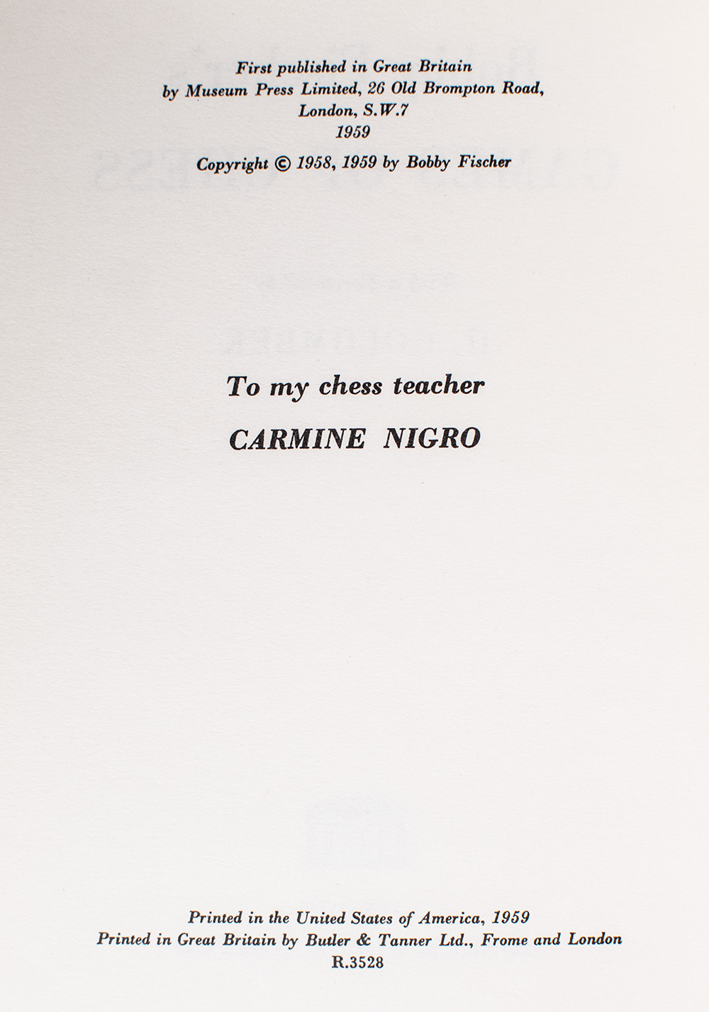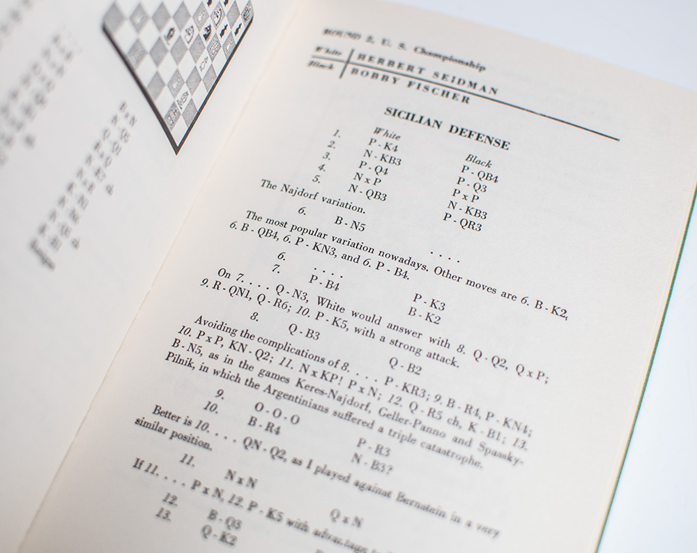This is the only book ever authored entirely by Bobby Fischer, and it was written when he was fifteen. It has historical significance as a prelude to the rest of the chess player's career. Within, Fischer analyses thirty-four games. He reflects on the experiences of thirteen games from the U.S. Championship Tournament of 1957-58 as well as the prize-winning "Game of the Century" from the Third Rosenwald Trophy Tournament. He also includes the scores of twenty games from the 1958 Portoroz Interzonal Tournament in which he played against Tal, Gligorich, Petrosyan, Bronstein, and more of the world's elite. The games in this book reveal Bobby Fischer's brilliance in middle and end-game strategy.