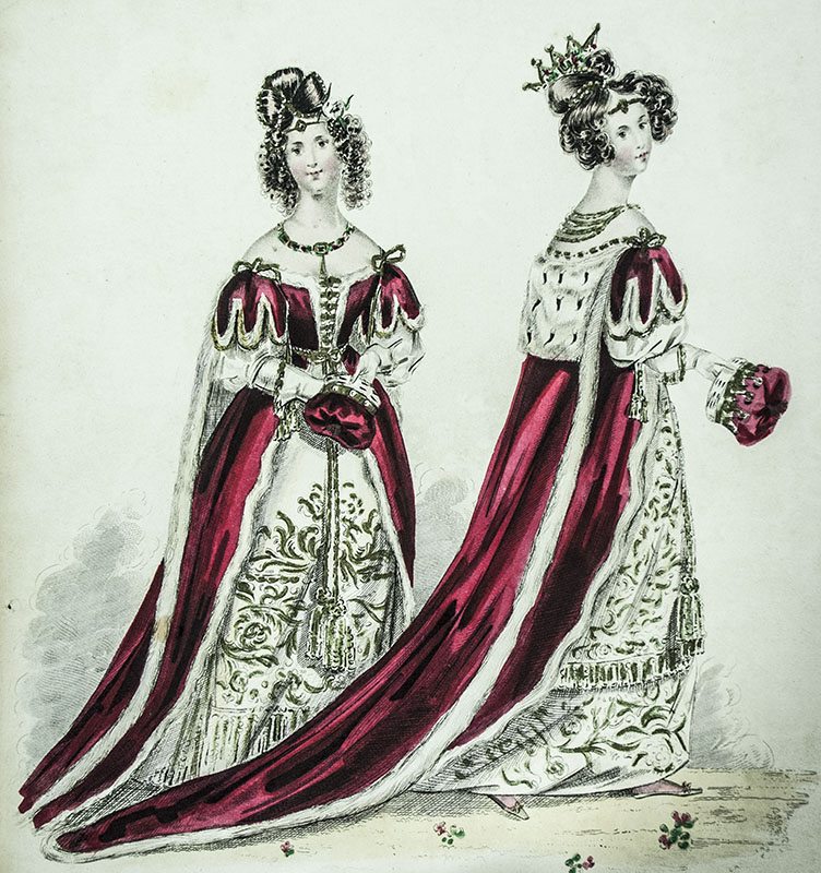 King George IV was known for his extravagant lifestyle and patronage of new forms of leisure and fashion which came to define the Regency Era throughout Great Britain. His coronation in 1821 was an enormous and magnificent event for which the new king commissioned a crushed velvet and ermine Coronation robe with a 27-foot train, a Coronation crown encrusted with over 12,000 diamonds, and Book of Common Prayer bound in traditional blue crushed velvet.