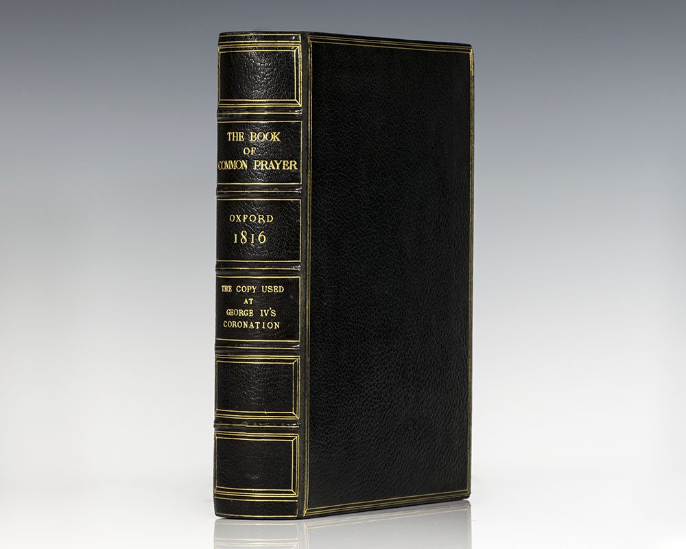 Royal Coronation edition of The Book of Common Prayer and Administration of the Sacraments used at the Coronation of King George IV on July 19th, 1821. Quarto, bound in full dark blue velvet, gilt arms of George IV to both front and rear panels, all edges gilt, housed in a custom locking full morocco clamshell box. From the library of American banker Mortimer L. Schiff, whose renowned collection of fine bindings was sold by Sotheby's in 1938, with his gilt leather bookplate on the front free endpaper. Laid in is a printed copy of Martin Luther's Hymn used in the Coronation ceremony. In very good condition in an excellent clamshell box. An exceptional piece of history from one of the most extravagant events of the Regency era.