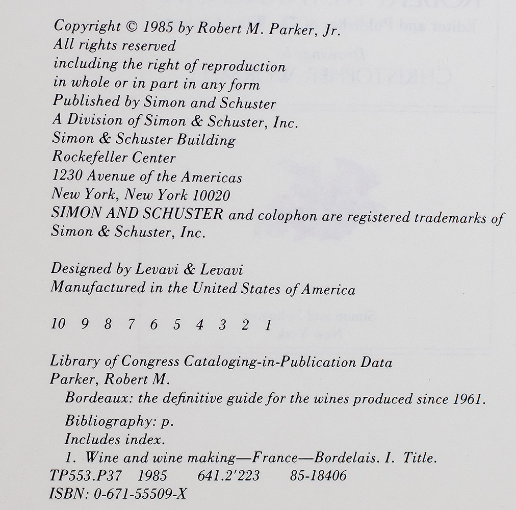 First edition of Robert M. Parker's first book and definitive classic in the field. Octavo, original half cloth. Signed by the author on the front free endpaper, "1/6/86 Robert M. Parker." Fine in a fine dust jacket. Jacket design by Koppel and Scher. Jacket illustrations by Christopher Wormell.