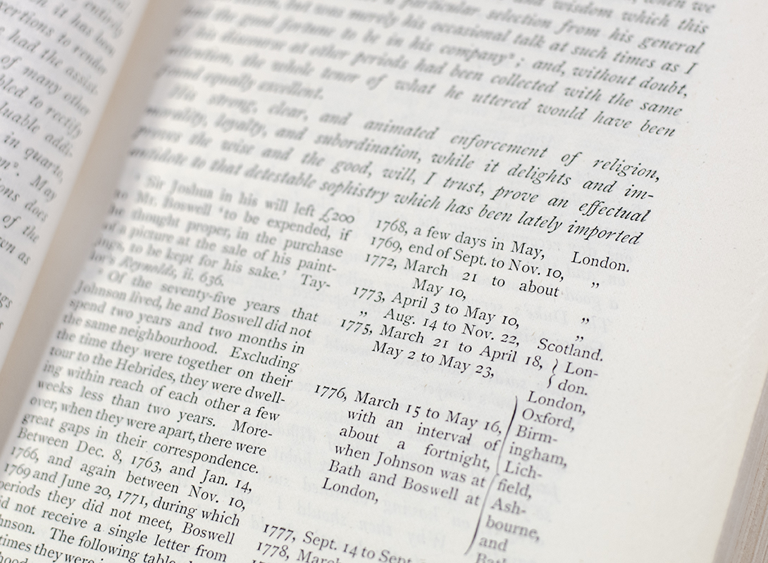 “Boswell excelled in insight into human nature and in ability to dramatize a situation… It was a crucial part of Boswell’s magic to give significance and vitality to the apparently trivial; it is this trait, together with his notable accuracy and unparalleled completeness of portraiture, that made him… ‘the Shakespeare of biographers” (Baugh et al., 1065-66). "One of Western literature's most germinal achievements: unprecedented in its time in its depth of research and its extensive use of private correspondence and recorded conversation..." (Gordon Turnbull, Oxford DNB).