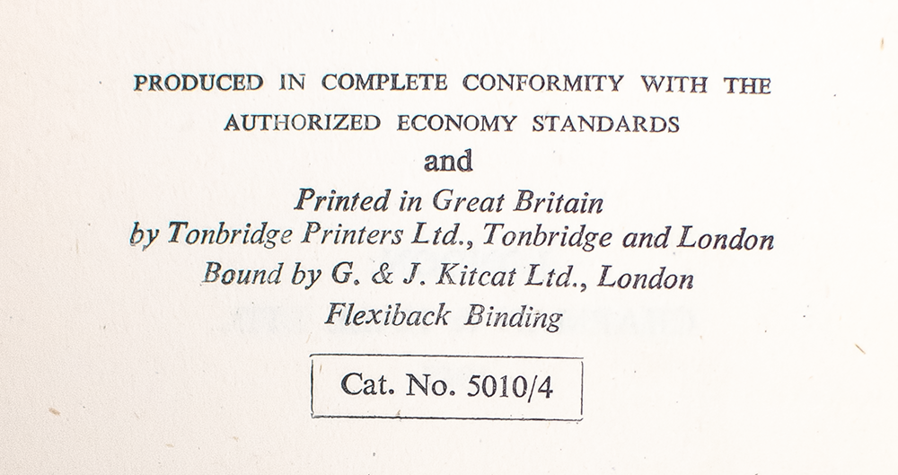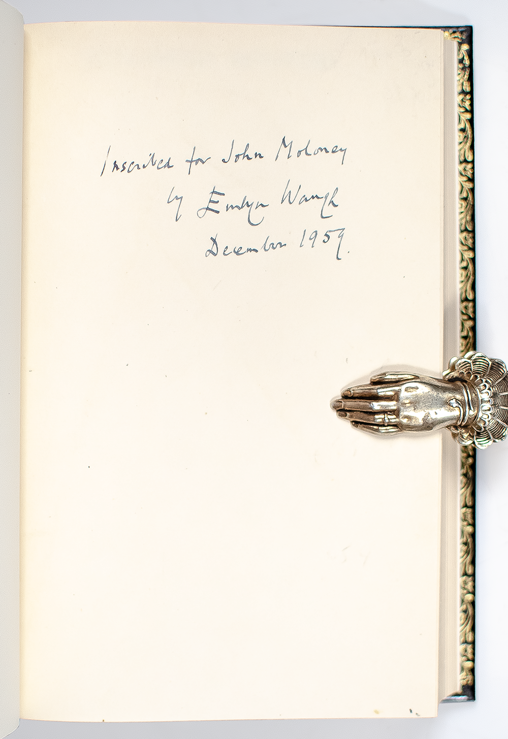 First edition of Waugh's masterpiece. Octavo, bound in full morocco by the Harcourt Bindery, gilt titles and tooling to the spine in six compartments within raised gilt bands, gilt ruling to the front and rear panels, gilt inner dentelles stamp-signed by the Harcourt Bindery, marbled endpapers, all edges gilt. Presentation copy, inscribed by the author, "Inscribed for John Maloney by Evelyn Waugh December 1959" on a page bound in. In fine condition.