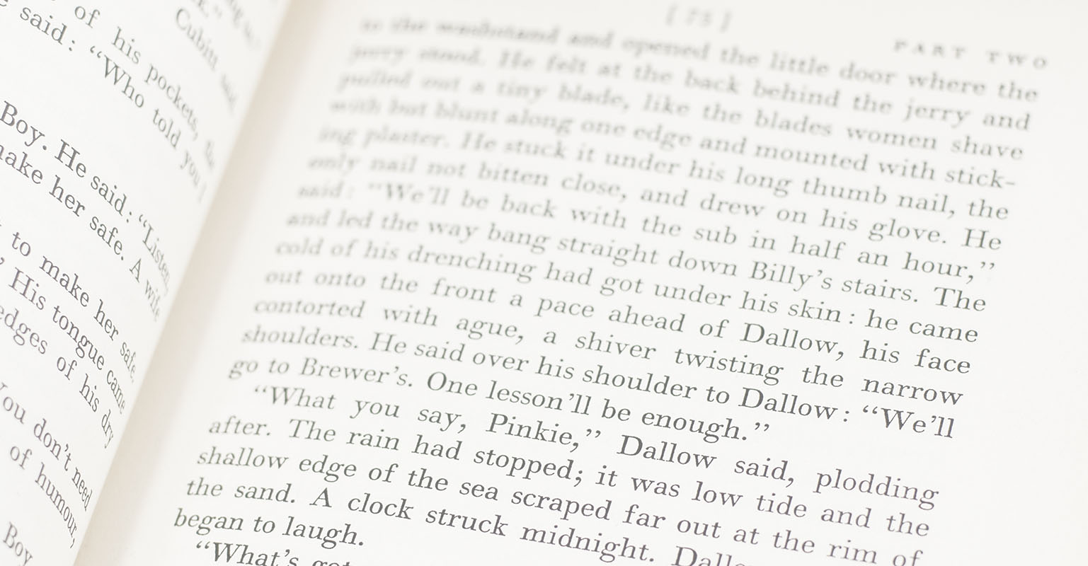 "Here the probing is carried further in a brilliant and uncompromising indictment of some of the worst aspects of modern civilization, showing us the hard-boiled criminal mind not as a return to savagery but as a horrible perversion of cerebration" (The New York Times). It is the basis for the 1947 film directed by John Boulting and starring Richard Attenborough as gang leader Pinkie Brown and the 2010 film, which stars Sam Riley, Andrea Riseborough, Andy Serkis, John Hurt, Sean Harris and Dame Helen Mirren.