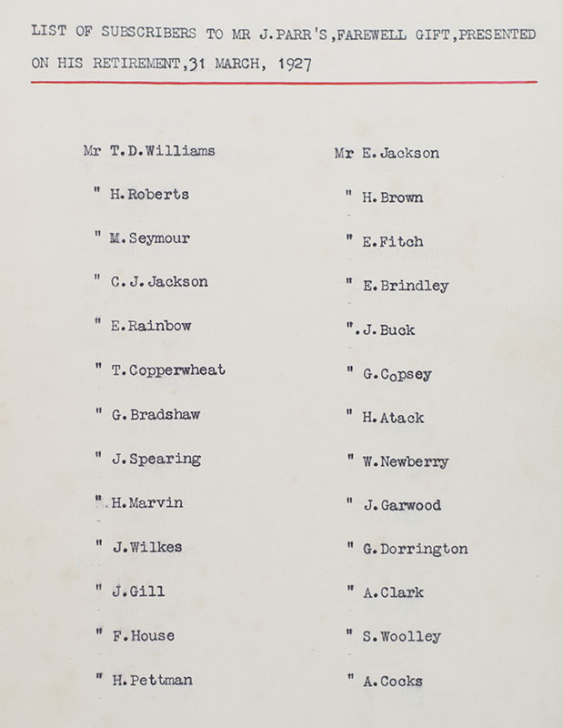 Finely bound list of subscribers to Mr. J. Parr's farewell gift, presented on his retirement , 31 March 1927. Octavo, bound by Truscott & Son in full crushed scarlet morocco with gilt titles and tooling to the spine in six compartments within raised gilt bands, quadruple gilt ruling to the front and rear panels, cipher of King Edward VII to the front panel, gilt turn-ins and inner dentelles, marbled endpapers. In near fine condition.