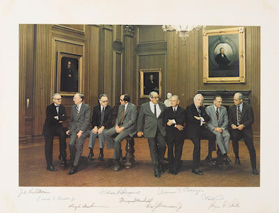 Large color photograph of the Burger Court, signed by nine justices and referred to as "first casual portrait of the US Supreme Court." The full color photo print of the famed photograph taken on January 10, 1977 of the 9 US Supreme Court justices casually sitting or leaning on a set of library tables is signed in the lower margin, "John Paul Stevens," "Lewis F. Powell, Jr.," "Harry A. Blackmun," "William H. Rehnquist," "Thurgood Marshall," "Warren E. Burger," Wm J. Brennan, Jr.," "Potter Stewart," and "Byron R. White." The image measures 17 inches by 11.25 inches. The entire piece measures 20 inches by 15.25 inches. Rare and desirable. An attractive and amusing image of this important court which presided over a number of issues relating to equality and freedom.