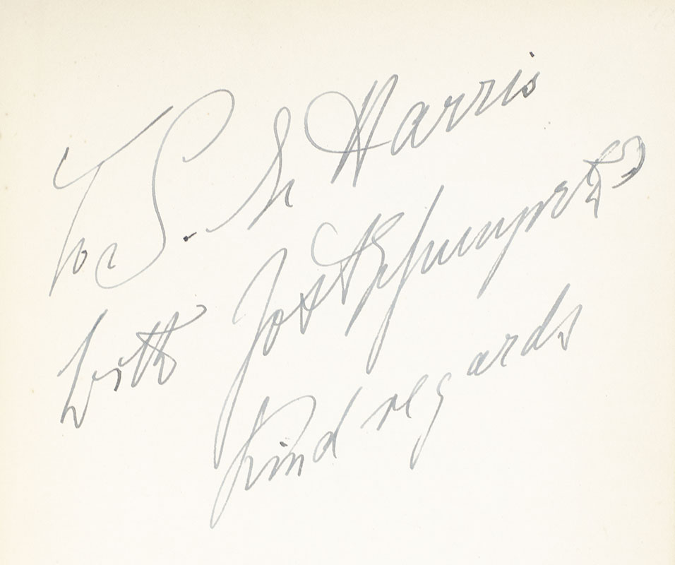 First edition of the economist’s ground-breaking work. Octavo, 2 volumes, original cloth. Association copy, inscribed by the author on the front free endpaper of volume one, "To Seymour Harris with kind regards Joseph Schumpeter." The recipient, Harvard economics professor Seymour Harris, was an editor of the book, Schumpeter as Social Scientist and editor of The New Economics; which Schumpeter was a contributor. In near fine condition with light shelfwear. Housed in a custom half morocco clamshell box. Books signed by Schumpeter are rare.