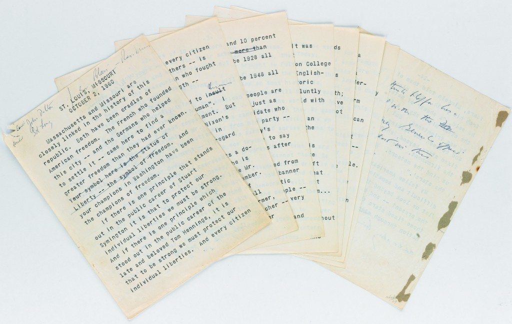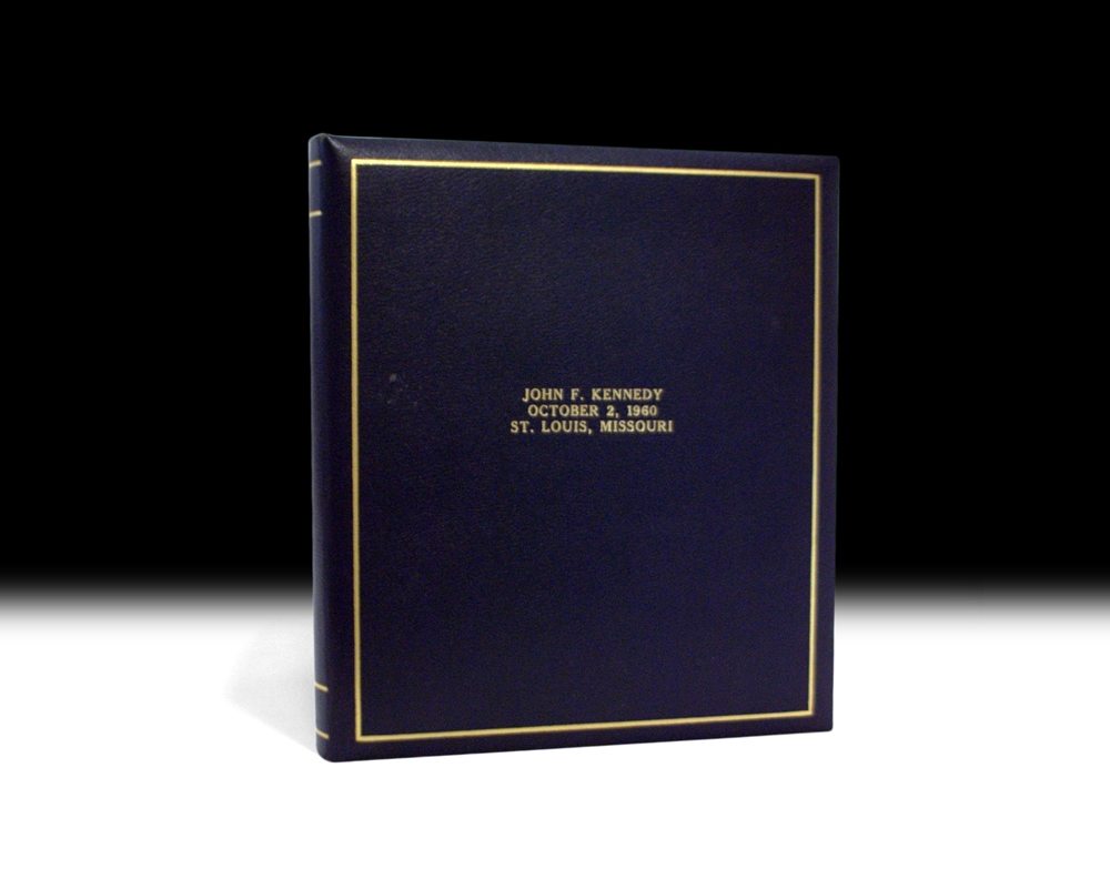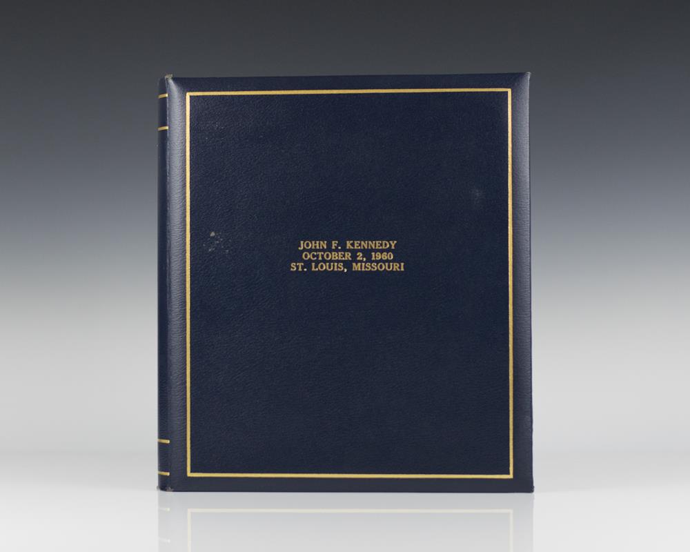 Original John F. Kennedy campaign speech with extensive annotations in his hand. This is a reading copy of the speech Kennedy delivered in St. Louis on October 2, 1960. Quarto, bound in a loose leaf folder with gilt titles and ruling to the front panel. 14 double-spaced pages, with notes in the presidential candidate's hand throughout. The speech begins, "Massachusetts and Missouri are closely linked in the history of this republic. Both have been cradles of American freedom. The French who founded this city -- and the Germans who helped to settle it -- came here to find a greater freedom than they had ever known. Your symbol here is the Statue of Liberty -- the symbol of freedom. And your champions in Washington have been the champions of freedom..." Bound with the speech is an engraved portrait of Kennedy and several mimeographs of newspaper clippings from The New York Times pertaining to Kennedys campaign, with headlines including: "Kennedy Dazzles Women on Tours", "Hoffa Will Press Drive on Kennedy", "Nixon, in Boston, Hailed by 250,000", "Kennedy Invokes Depression Fears", and "Kennedy Gets Political Phrases From Five-Foot Shelf Writers."